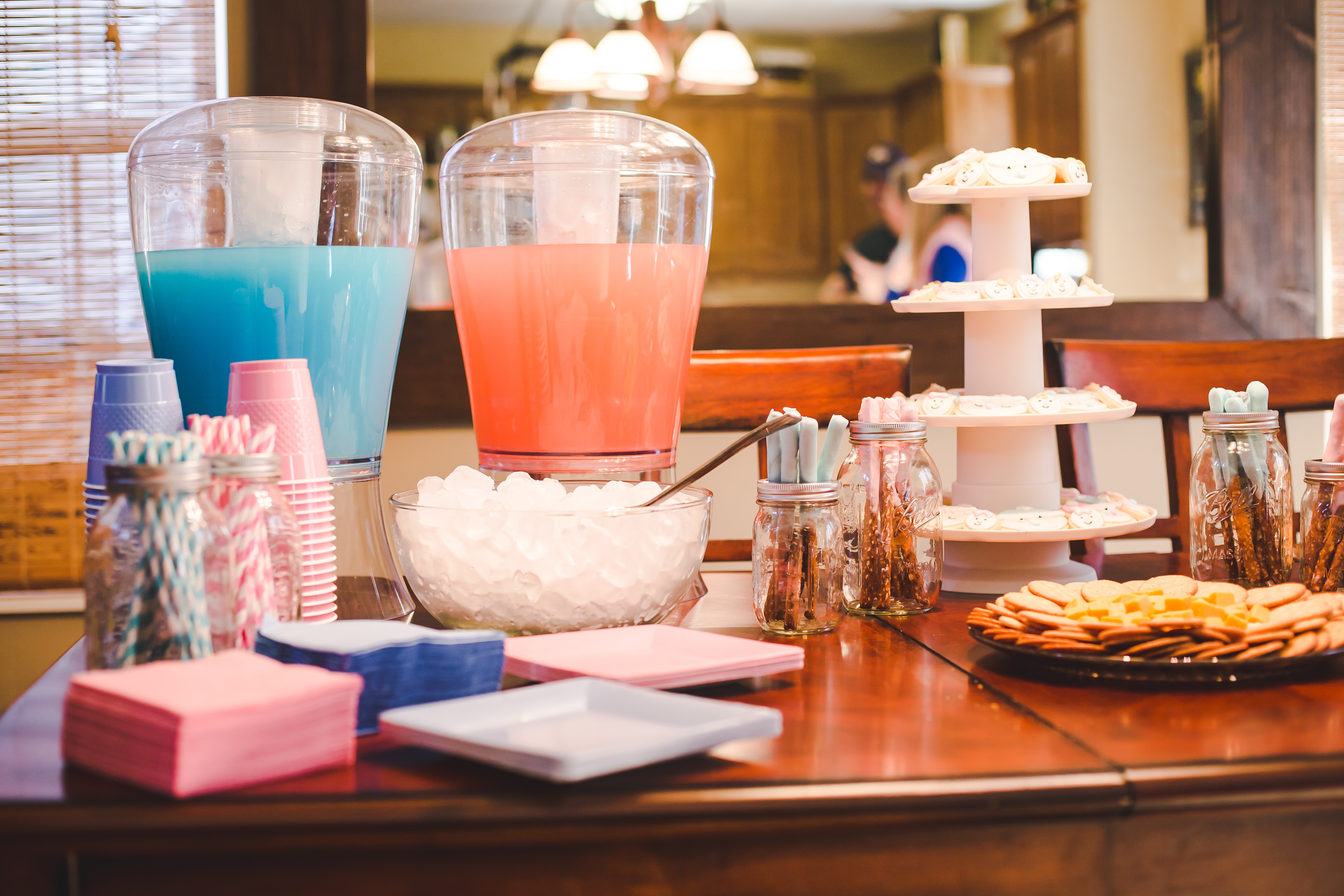 The decor for our gender reveal was mostly pink and blue. We had pink and blue lemonade, cups, plates, etc. I really love mason jars so we had to incorporate those into the food table. My friend Dani made the pink and blue dipped pretzels. The baby cookies were housed on the tall white stand. Photo Credit: Magruder Photo + Design