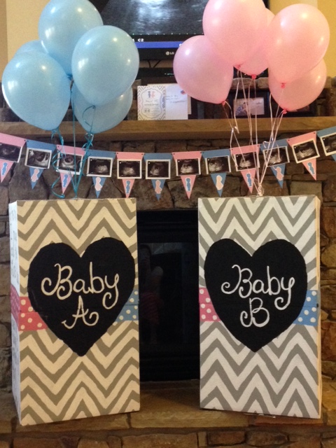 Baby A (the baby on my left side) is a boy and Baby B (the baby on my right side) is a girl, which is actually what we thought they were. Baby A has always been so active during the ultrasounds that I thought “he’s energetic like his brother” and referred to it as “he” from about 12 weeks. Since T was convinced we were having one of each, I assumed B was a girl but my feelings weren’t as strong with her. At 15 weeks, their heart rates were 14 BPM different and that made me feel more confident that we were having one of each. We also watched our DVD of the full anatomy scan after the reveal to make sure the balloons and envelope were accurate 🙂