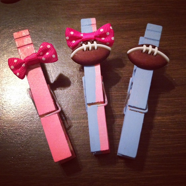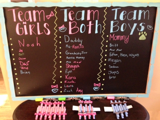 I wanted everyone to be able to participate in our reveal and to make it fun! I was worried that it would be awkward before and after the box opening if our guests didn’t have something to do! We decided to have everyone pick a team: Team Boys, Team Girls or Team Both. Our guests wrote their names on the scoreboard (see below) and wore the appropriate colored pin. I hand-painted the pins and hot glued the bows and footballs I found at Hobby Lobby. Tommy and I are big football fans so footballs with bows were perfect for us!