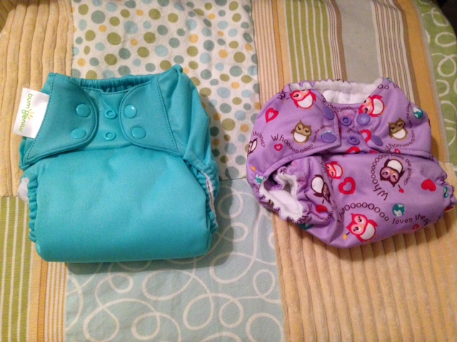 The two cloth diapers pictured are the first two diapers in our cloth diaper collection– a teal Bumgenius all-in-one diaper and a purple owl Rumparooz pocket diaper. Can’t wait to take a picture of these adorable diapers ON our babies!