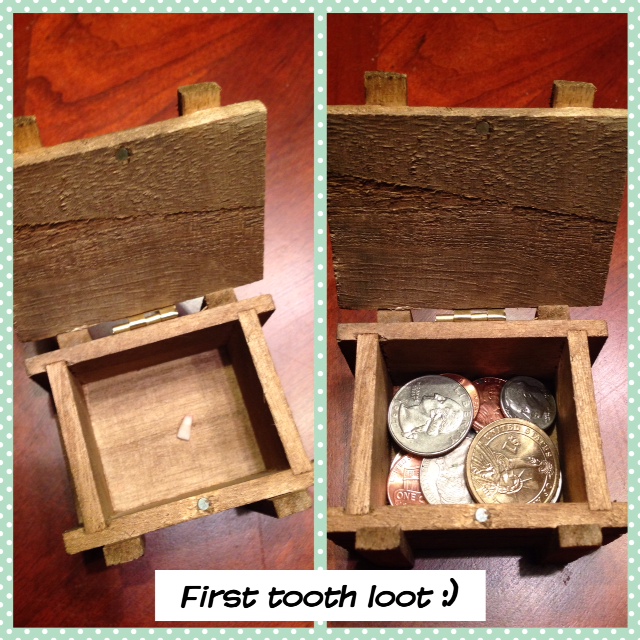 On Wednesday, Noah lost his first tooth and the Tooth Fairy came to visit. Noah was terrified that losing his tooth would hurt. It has been loose since February 26th, but he would barely wiggle it. Since Tommy is away for work, we Face-Time him each night before Noah goes to bed. He and I have been encouraging Noah to wiggle or pull his tooth. By Wednesday, it was at an almost 90* angle and his adult tooth is already growing behind it. After a few minutes of nervous crying, Noah finally pulled it. He was so proud when that tiny tooth was in his hand and I was excited that we all got to experience it as a family via Face-Time! We put his tooth into a tiny wooden treasure chest for the Tooth Fairy. When he woke up on Thursday morning, the Tooth Fairy had replaced his tooth with a treasure of different-colored coins. He was so excited and jingled that treasure chest all the way down the stairs to show it to me!