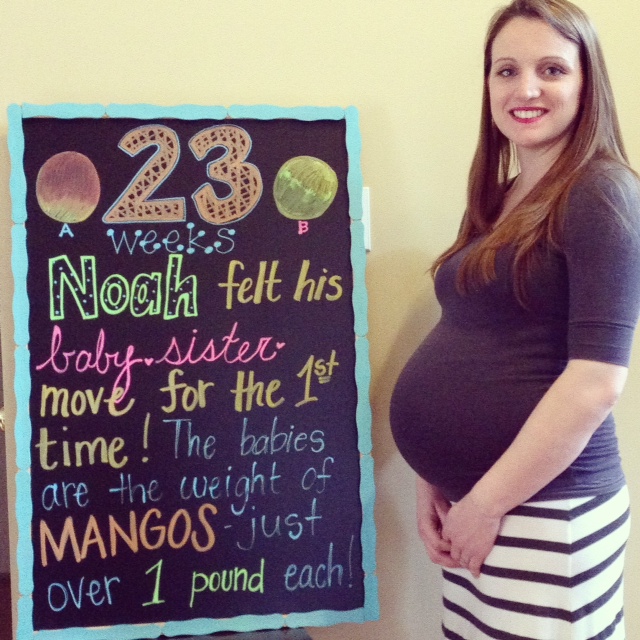 This week has been very tiring on the pregnancy front. I had a great week last week relaxing on Spring Break. I think my body really appreciated the naps and time off my feet. Since Saturday, I have had sporadic pain and tightening most nights. Since we returned from vacation on Friday, I have been going non-stop between our family-filled weekend, Bible study at our house and work. I have not been resting as I should and I think that played a big part in my discomfort this week. On Wednesday morning, I had sharp pain on my right, then left sides below my belly. I discussed it with my OB and she said it was most likely round ligament pain and not to worry unless I had bleeding or fever. We all know how great I am at not worrying, right?! Thankfully, the pain subsided. On Thursday, my feet were throbbing by the end of my work day. I guess I chased too many Kindergarteners around the room! I know I need to do a better job of taking it easy so these babies will stay put for several more weeks! I look forward to reaching the first milestone of viability and seeing my babies on the growth ultrasounds next week 🙂