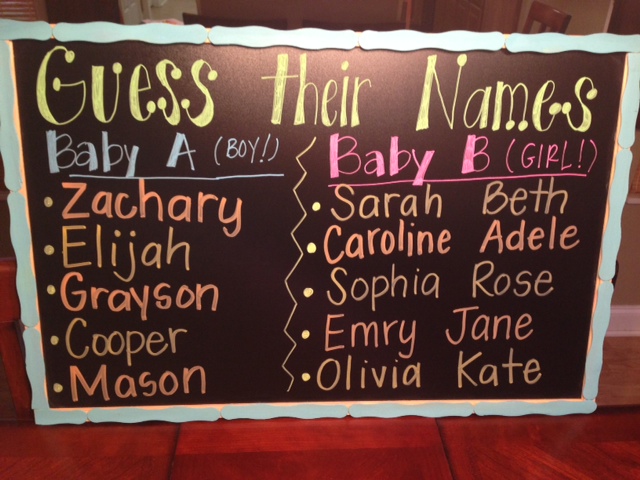 Let’s have some fun! Tommy and I just decided the names for our sweet twins! We have been saying them so much to each other the past few days that I am afraid they will slip out when talking to someone else! We decided it was time to reveal them. The chalkboard has played a big part in my weekly blog posts and pictures, so I decided to use it to help announce our names! It’s time for YOU to make your guess. Please comment with your name guesses, one for each baby, TONIGHT (it will be more fun that way!) below this blog post. Each night this week, I will eliminate one name from each list and post the new picture to the blog. You can comment with new combinations/guesses each night, if you want! By Sunday, everyone will know which names we chose! Happy guessing 🙂