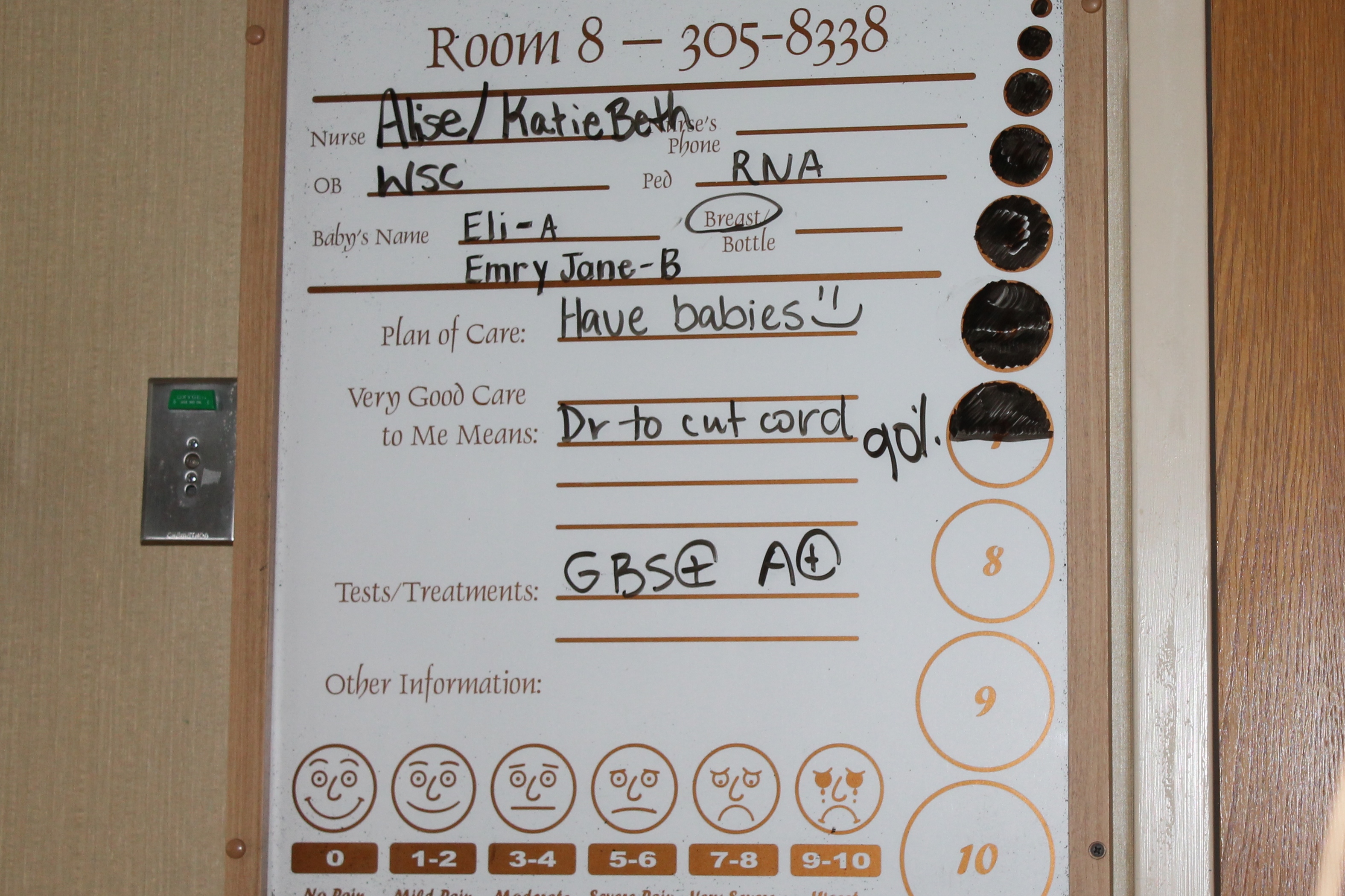 At 12:30 pm, my OB returned to check on me and I was fully dilated and effaced! It was almost time to meet our babies! Since we were having twins, we knew that I would be delivering in the OR in case they needed to perform an emergent C-section. I would “labor down” until Baby A was well into the birth canal before they would roll me to the OR for delivery. Now that I was fully dilated, my OB wanted me to push and see how far down I could move Baby A. Unfortunately, I had a hard time pushing. I was too numb from the recent anesthetic to be able to push effectively through my contractions. Tommy updated the board and got his scrubs on so that he would not have to wear the “bunny suit” in the OR.