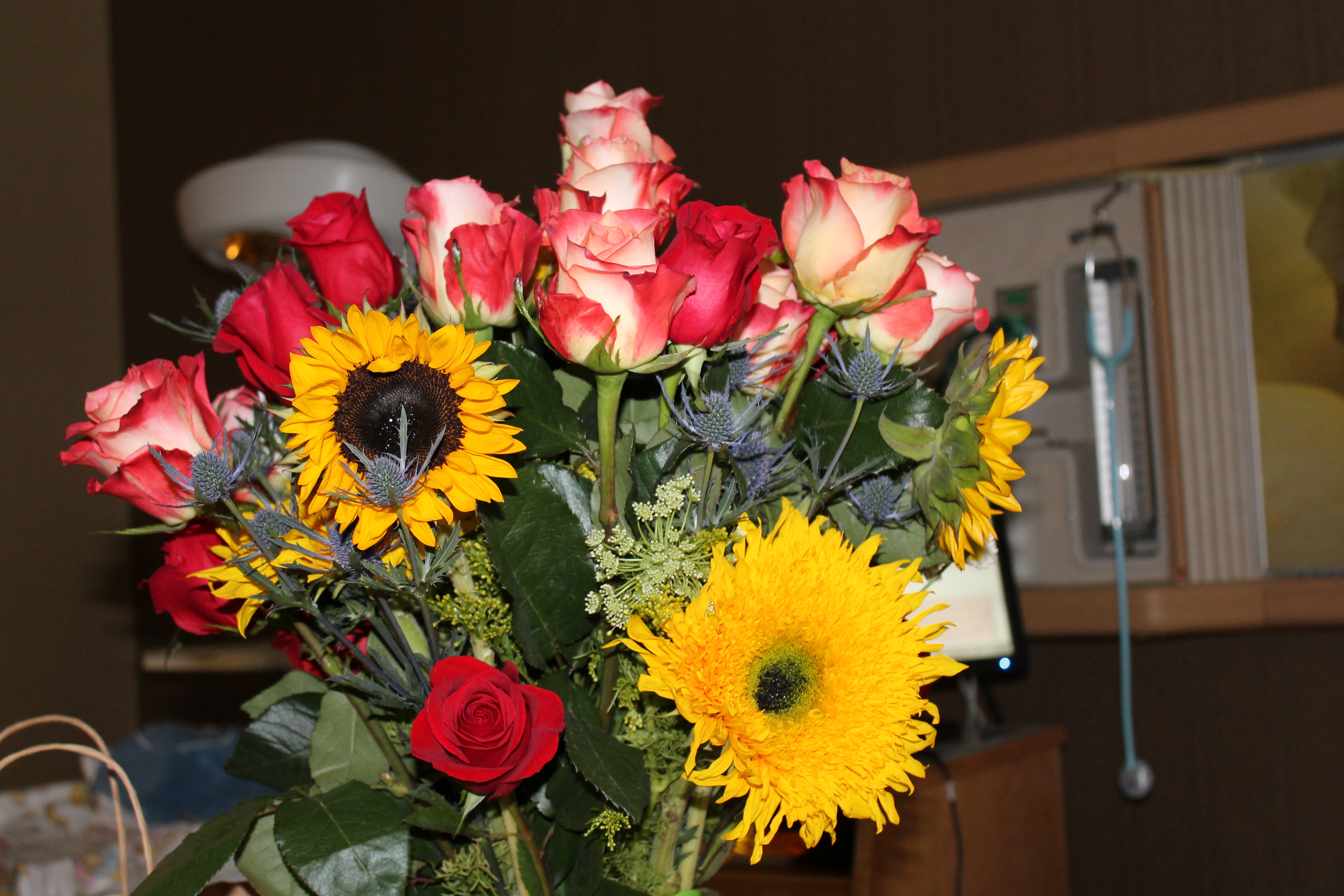 Over the next 3 hours, I would have mini pushing sessions every 30-45 minutes to try to move Baby A down. I got really emotional when we stopped each of these sessions because Baby A was not moving down when I was pushing and I was terrified of having a C-section. If you know me, you know I like things to go according to plan! I think this fear was amplified by the fact that my nurse (who was really wonderful 99% of the time!) prepped me by washing my belly and kept bringing supplies into the room “just in case I needed a C-section.” Our families tried to keep me distracted and would come hang out in the room with me between each pushing session. I also had beautiful flowers from Tommy to keep me company. He had ordered them for our anniversary (before we knew we would be having our babies!) and had his sister Amy bring them to the hospital.