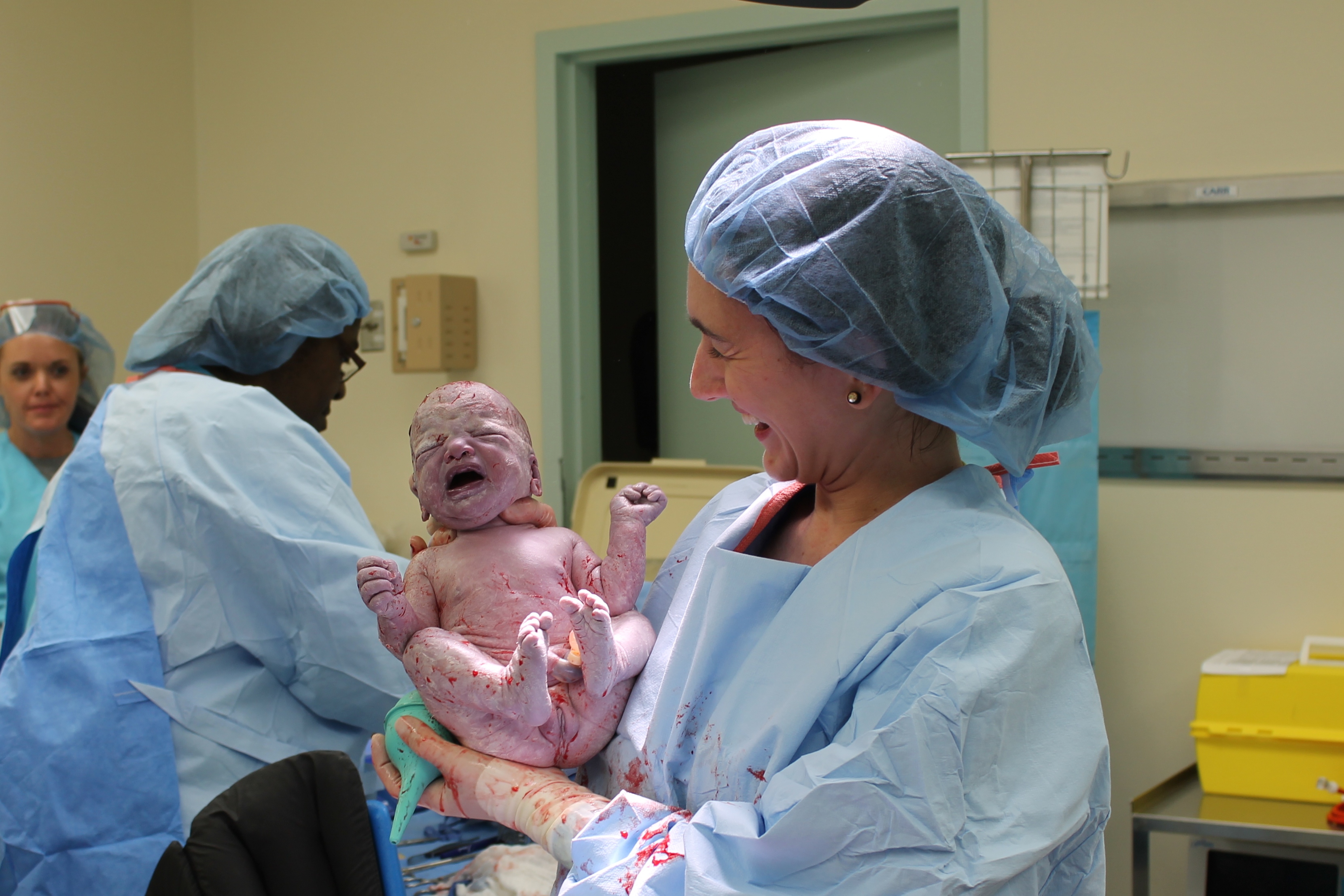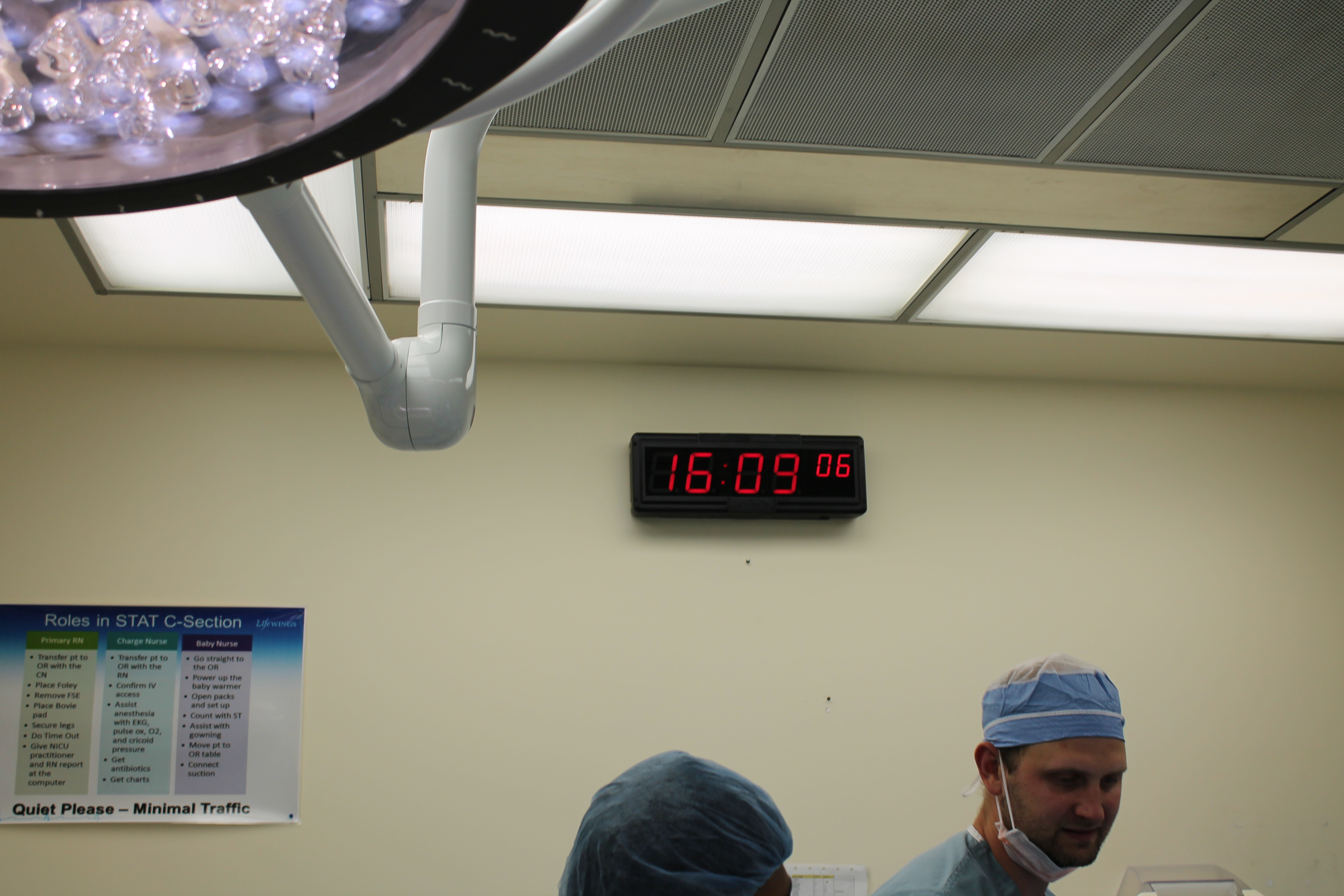 By 3:00pm, the anesthetic had worn off enough that I could feel when I was contracting. They were not pleasant but it was not too bad– and I was ready to meet my babies! The nurse decided that it was time for me to start pushing for real! She asked for everyone to leave and brought down this crazy UFO light (I guess to help them see?!) and had another nurse in the room to help.