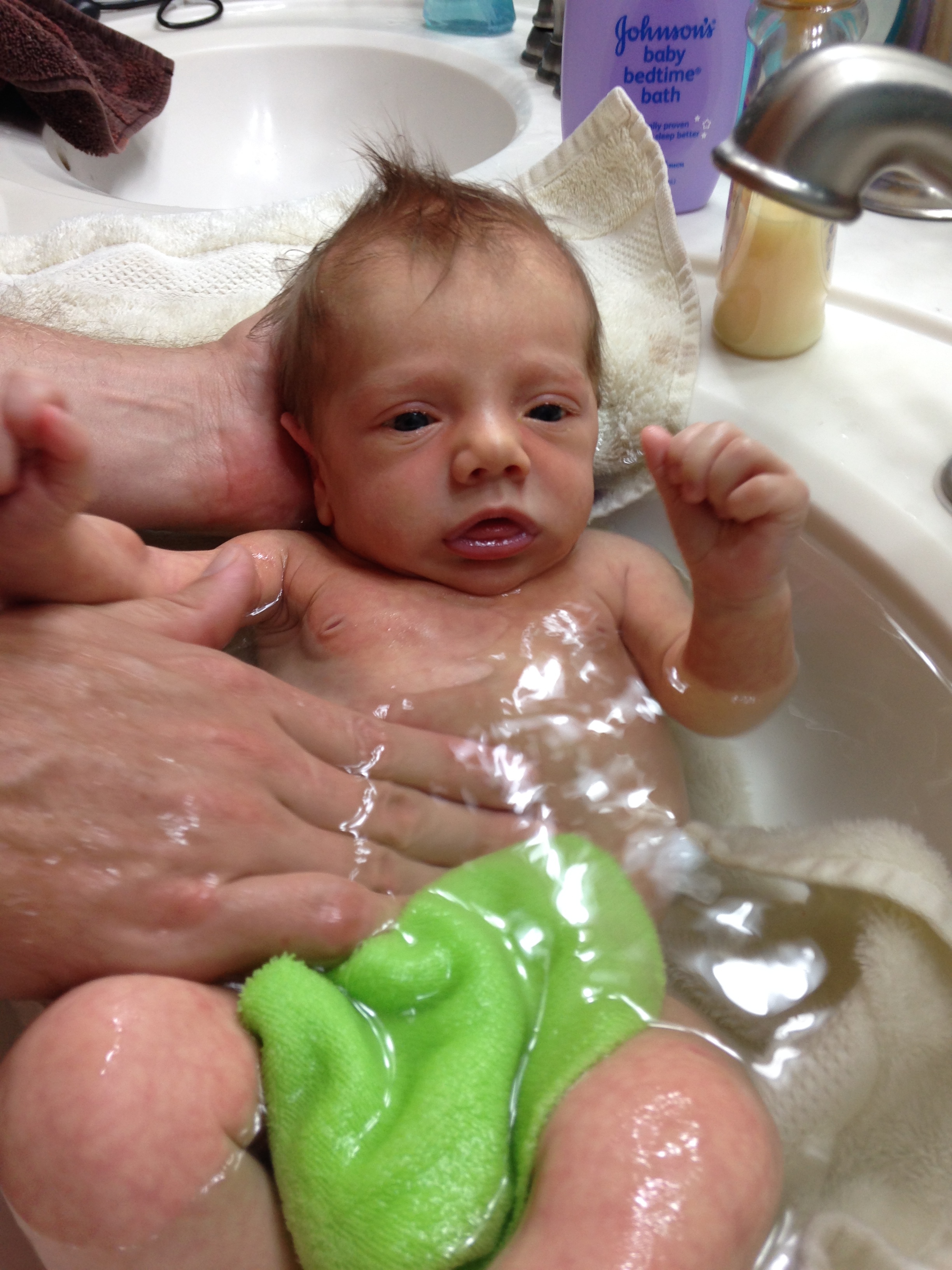 At two months, Eli weighs 8 pounds 6.5 ounces. He’s gained a little over 3Â pounds since coming home from the hospital. He loves to be held, especially by Mommy. He likes warm baths. He dislikes car rides, loud noises, getting his hair washed and any time he is not being held. Ha! He does well when eating from a bottle and is still a slow nurser, even with the nipple shield. He has a sensitive stomach and tends to be very gassy! He is notorious for kicking off his socks. He is always flailing when Mommy wants to take a picture of him, so they almost always turn out blurry! Eli is pictured here in his Daddy’s going home outfit.