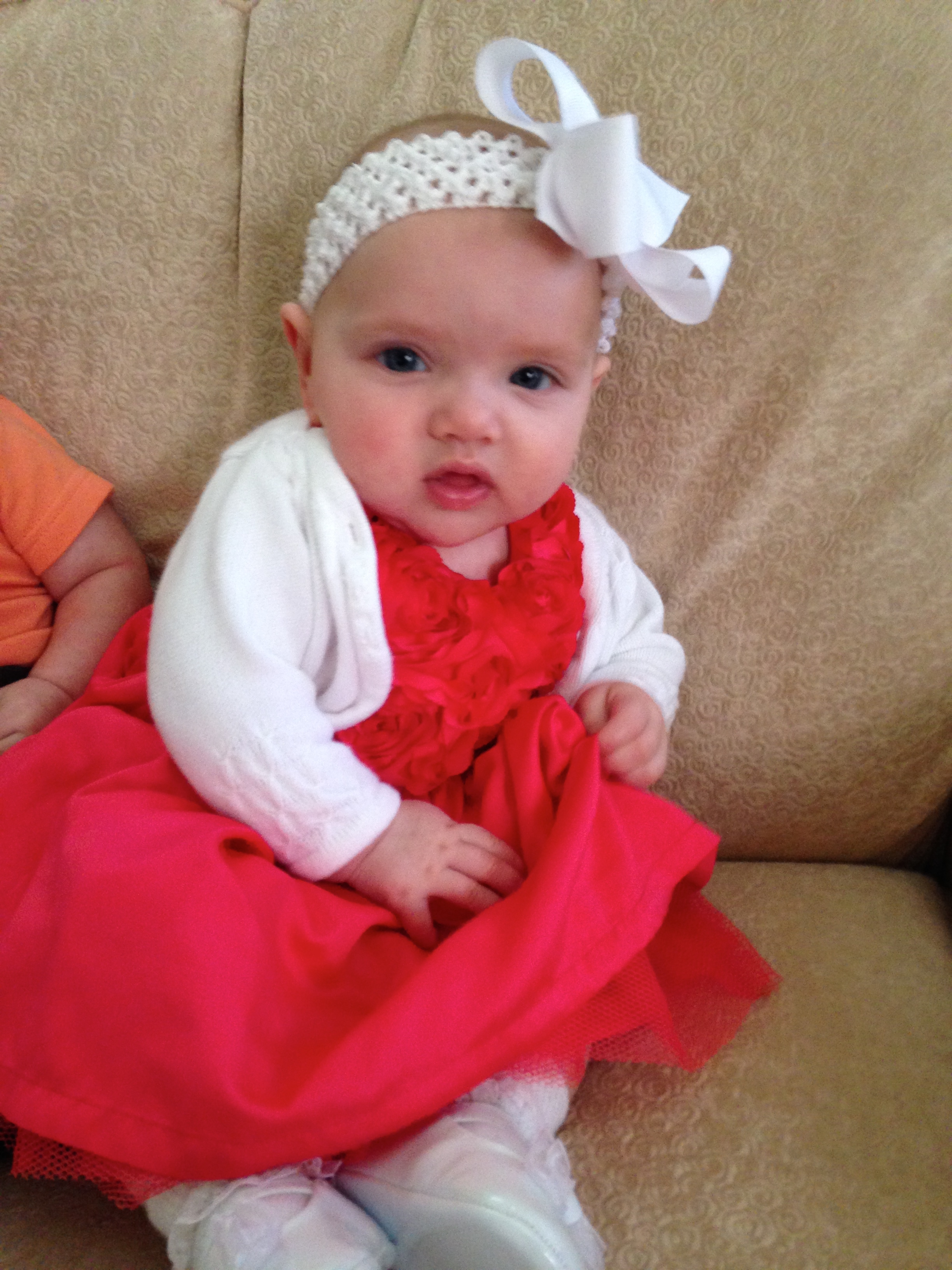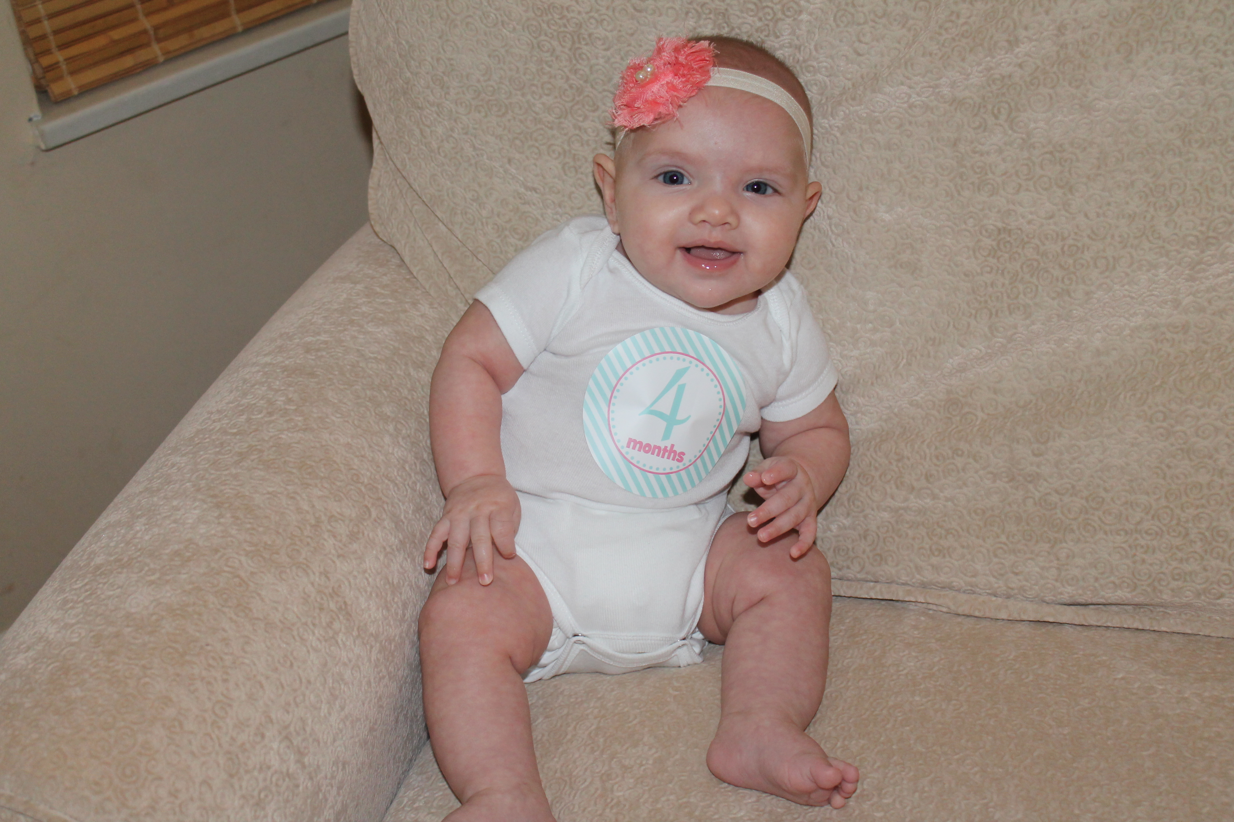 Emry Jane no longer earns her “Cowbird” nickname, she eats much less than Eli, but she is every bit of a “Princess.” Princess Emry Jane. Daddy is her favorite person– and probably to blame for most of her spoiled-rottenness! She is the stubborn one for sure! She arches her back and throws herself around like a two year old. We have to be very careful when we are holding her or have her propped up in the corner of the couch/chair. She WILL NOT do something if she does not want to, eating included. She has a bit of a temper. She is social smiling more, but still significantly less than Eli. She is stingy with those 🙂 She has a very sweet laugh but she saves that for special occasions too. She likes bath time and splashes as much as her brother now. She can roll both ways– belly to back and back to belly! (She rolled onto her belly for the first time at the check up TODAY! Show off.) She is very vocal, lots of oohs and aahs, especially to the shadows from the lamp at 3 am. Emry Jane weighs 13 pounds 6 ounces (also 25th percentile) and is 23.5 inches long. Her hair is growing in very light and her eyes are also very blue! Her reflux is much better– she has been off meds for the past 2 weeks and has been doing great without the medicine.