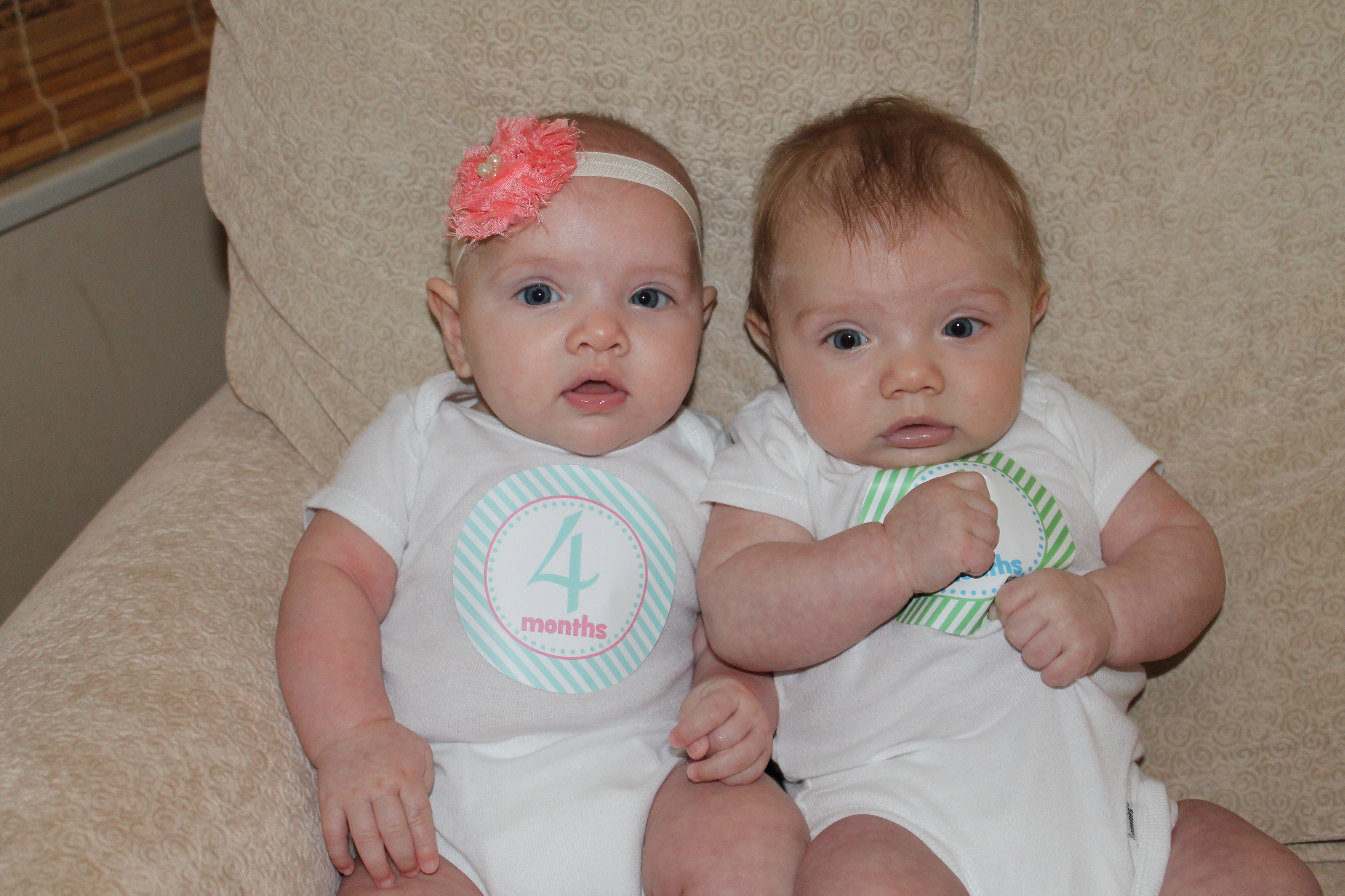 The twins are technically four and a HALF months old now. I waited to post for a couple of reasons. 1) I wanted to post accurate “4-month” weights from the doctor. We went for their 4-month check up this morning. 2) We’ve been really busy lately and I have not had much blogging time. 3) I was in a dark place for a couple of weeks when the babies decided that they were no longer interested in sleeping at night.