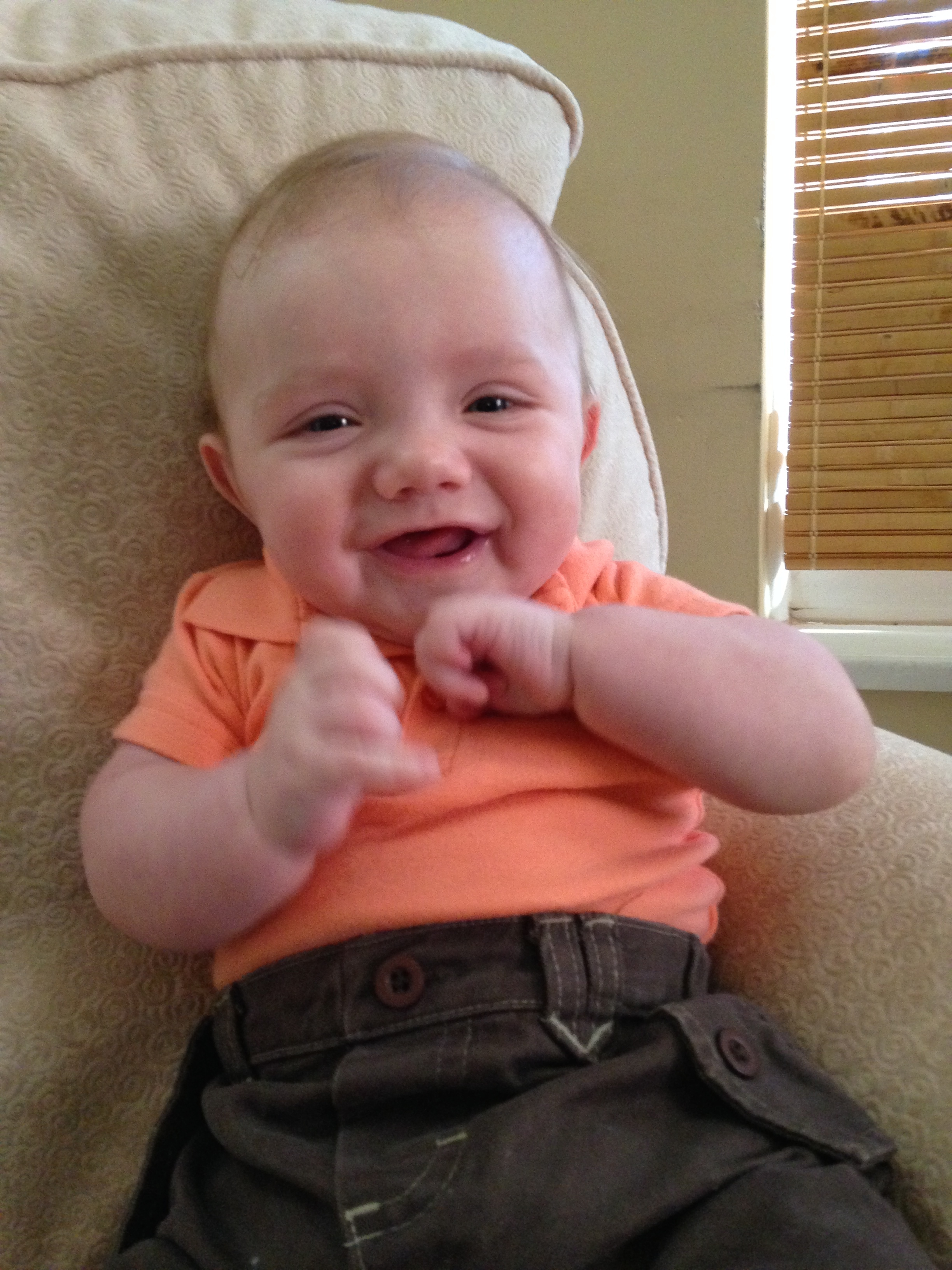 Eli has really filled out his little arms, legs and cheeks over the past month. He loves to smile and laugh. Bath time is the best time of the day for him! He loves to kick his feet and splash in the tub. He is very ticklish– pretty much anywhere but especially his thighs, chest and feet! He shouts before he sneezes, which is quite possibly the cutest thing ever. He has no interest in rolling over and hates tummy time. Mommy is his favorite person. He is afraid of loud noises/music and pouts when he is scared. We found this out when taking him to Cokesbury’s contemporary service for the first time (Emry loved the loud music and lights!) He is very laid-back unless he is hungry. If you do not feed him when he is ready, he will let you know how he feels about it with VERY LOUD crying. Eli weighs 14 pounds 13.5 ounces and he is finally on the growth chart!! Not only on it, but 25th percentile… WHOOP WHOOP 🙂 He’s also now a pound and a half HEAVIER than his sister. He is 24 3/8 inches long. His hair is getting lighter and his eyes are still very blue!