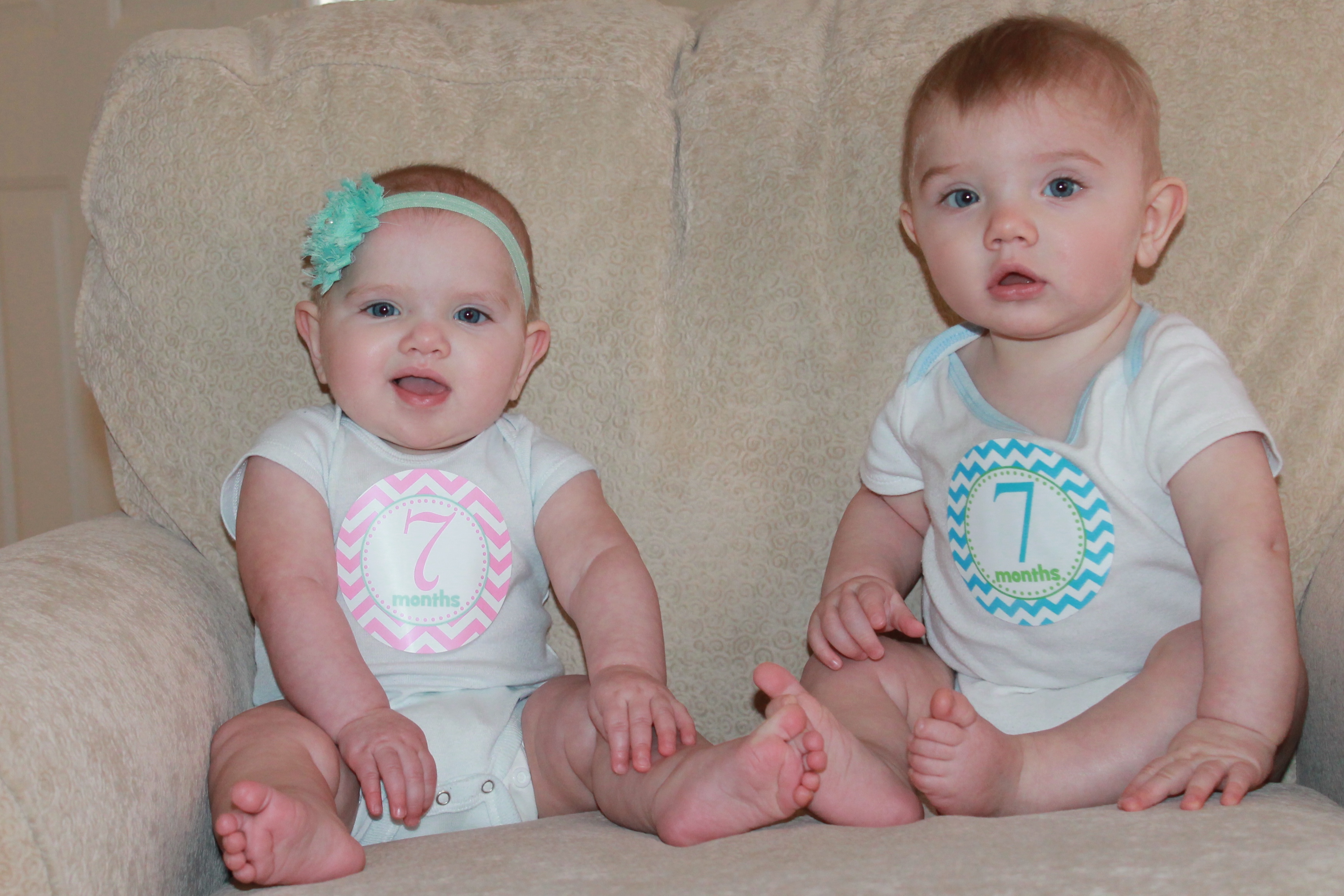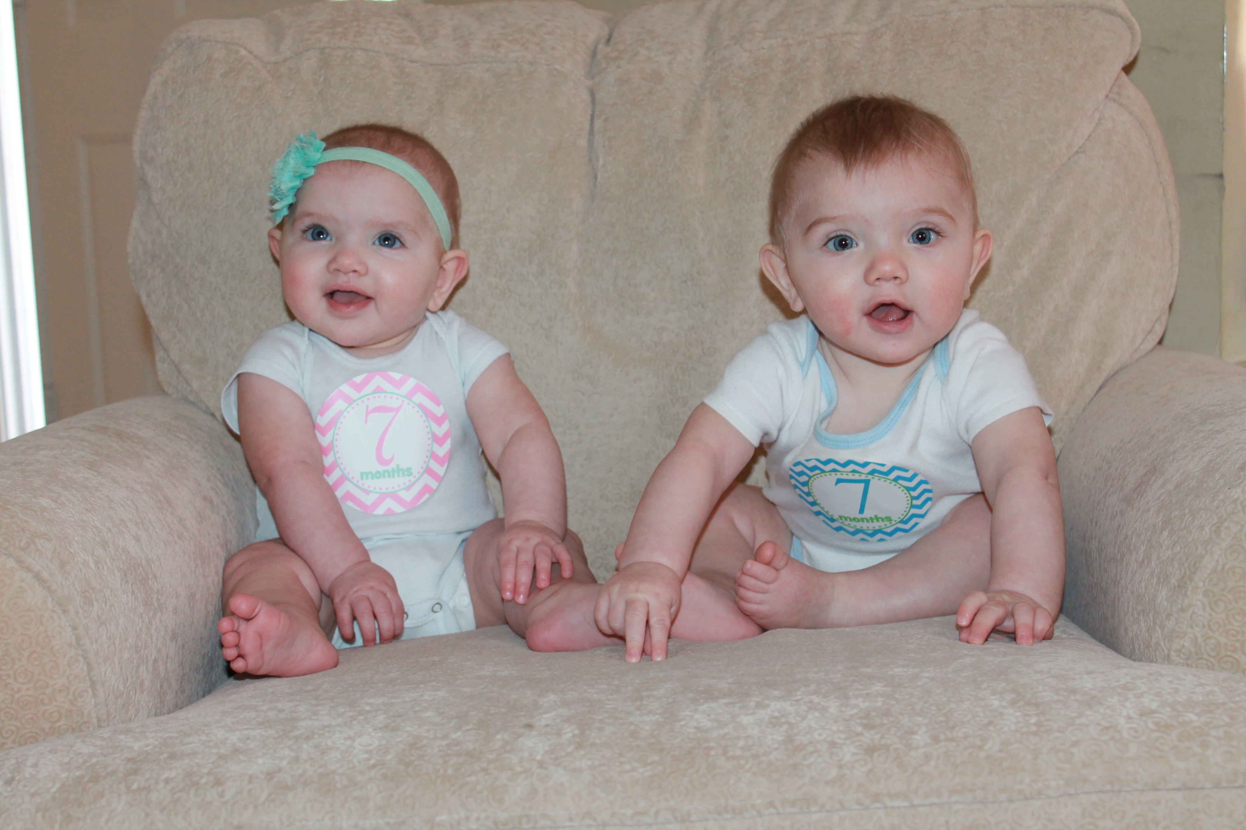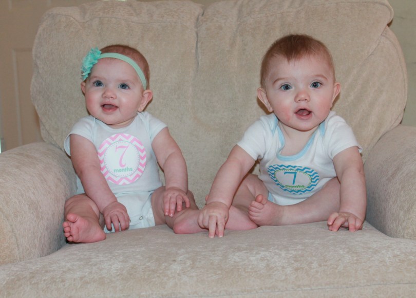 Now that the twins have hit 7 months, I think we are FINALLY on a predictable schedule. They wake up for their first bottle around 5:30am. I warm their milk, change their diapers and pump while feeding them then everyone goes back to bed. I get Noah up at 6:45am for school and then get the twins up around 7:15 to take him to school, if they are not up already. Eli tends to wake up on his own around 7am. We usually eat breakfast at 8:15, usually oatmeal and/or fruit. This morning, it was half a jar of apricot, apple, pear puree per baby. They have their second bottle around 9:30am. Each bottle is between 7 to 8 ounces, 5-6 ounces of breast milk and 1-2 ounces of formula mixed together. It has to be warm or my picky children will not take it 🙂 I use a crockpot of warm water to warm the bottles since my Keurig died a few weeks ago. It has been working well so far. I pump during each feeding for 20 minutes. The babies are finished within 5-10 minutes with their bottles, but they usually fall asleep or play in the floor of the nursery beside me until I am finished. They nap after their bottle until 11/11:30am. We eat lunch around 12pm. I offer them chunks of fruit or vegetables that they can feed themselves or a jar of fruit and a jar of vegetables to share. Third bottle at 1/1:30. Second nap around 2pm. Fourth bottle at 4/4:15. I usually do not offer them any baby food between those feedings since they are closer together. If they are really fussy or tired, I will put them down in their cribs for a short nap between 4:30 and 5. I do not let them nap past 5:30. We have dinner around 6pm as a family. We offer a vegetable that we are eating for dinner and sometimes a puree as well. They also like to eat organic sweet potato puffs and yogurt melts if I put them in their high chairs while I make dinner. We do baths around 7:15pm and have their last 8-ounce bottle at 7:45pm. By 8pm, they are both asleep for the night. We are still cloth diapering during the day and I change their diapers every 2-3 hours. We use disposable Pampers Swaddlers size 3 at night. We go through 2 per baby a night, so we can make a box of diapers last a long time– not too shabby!