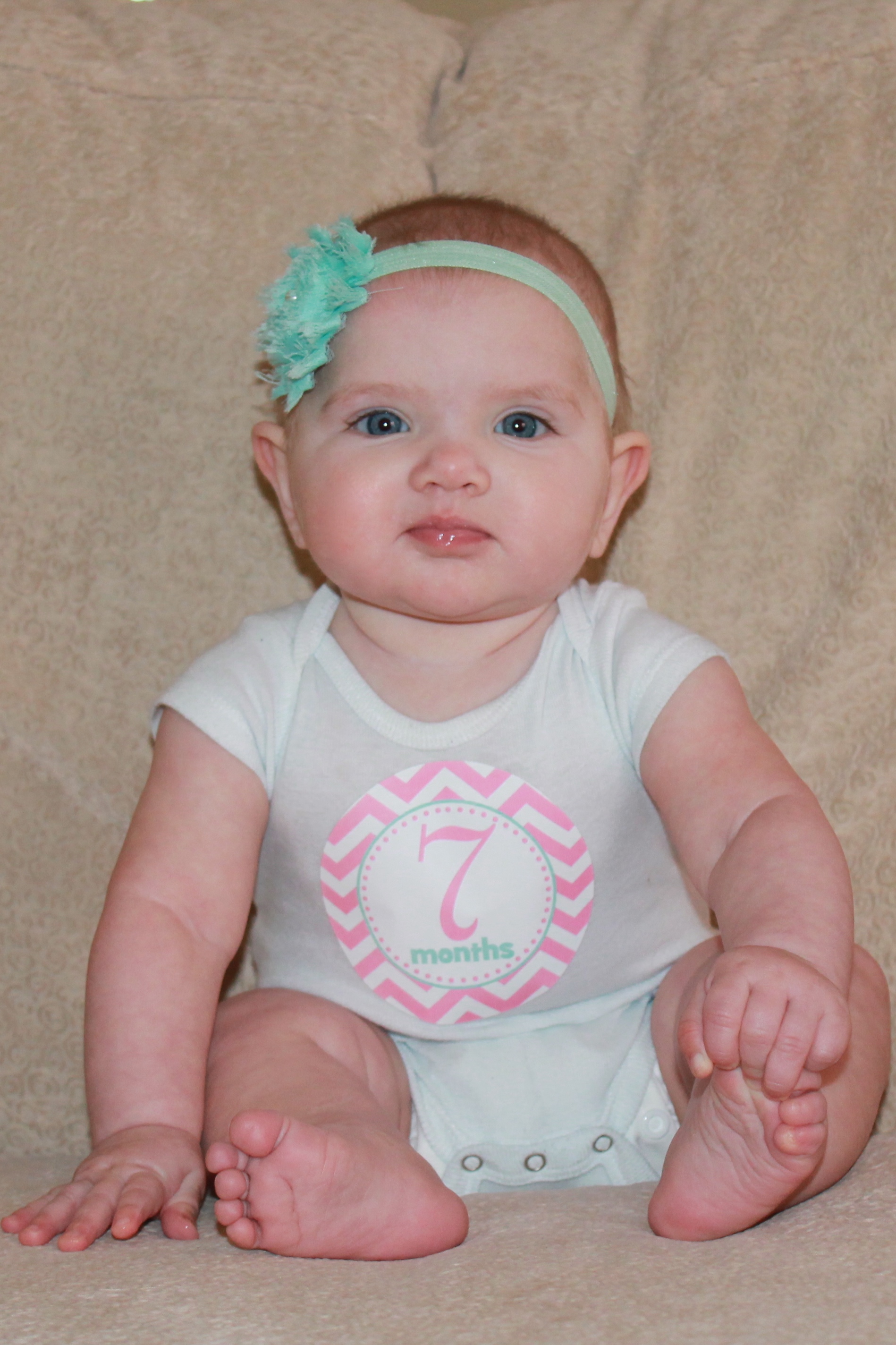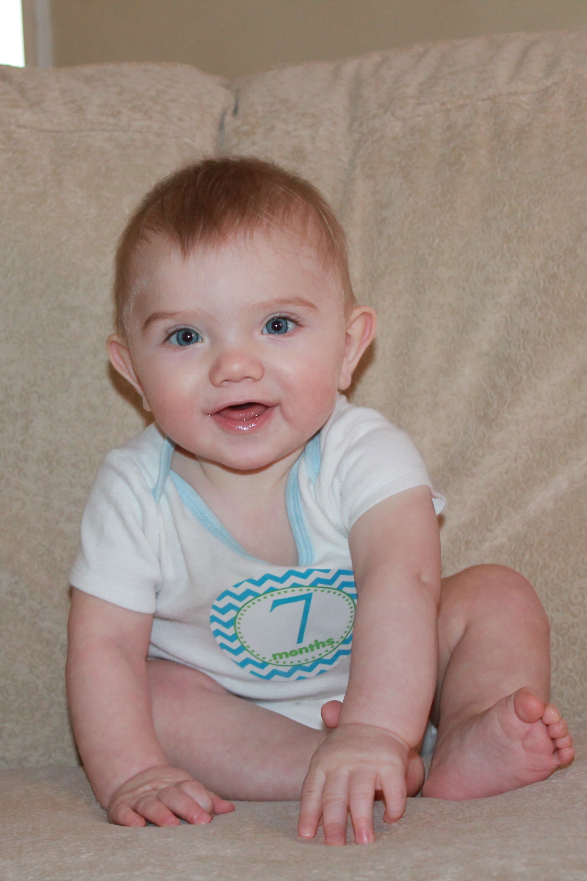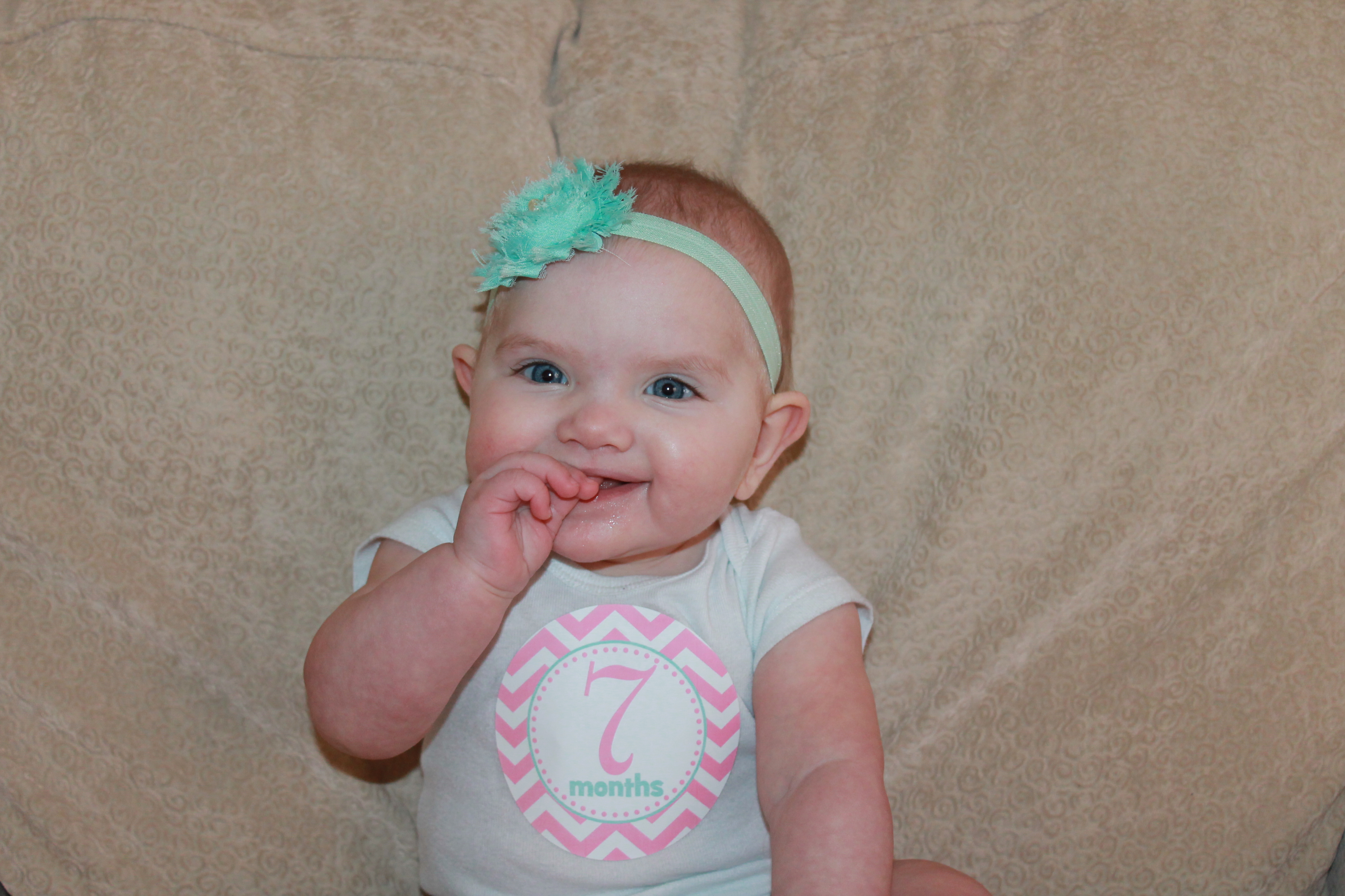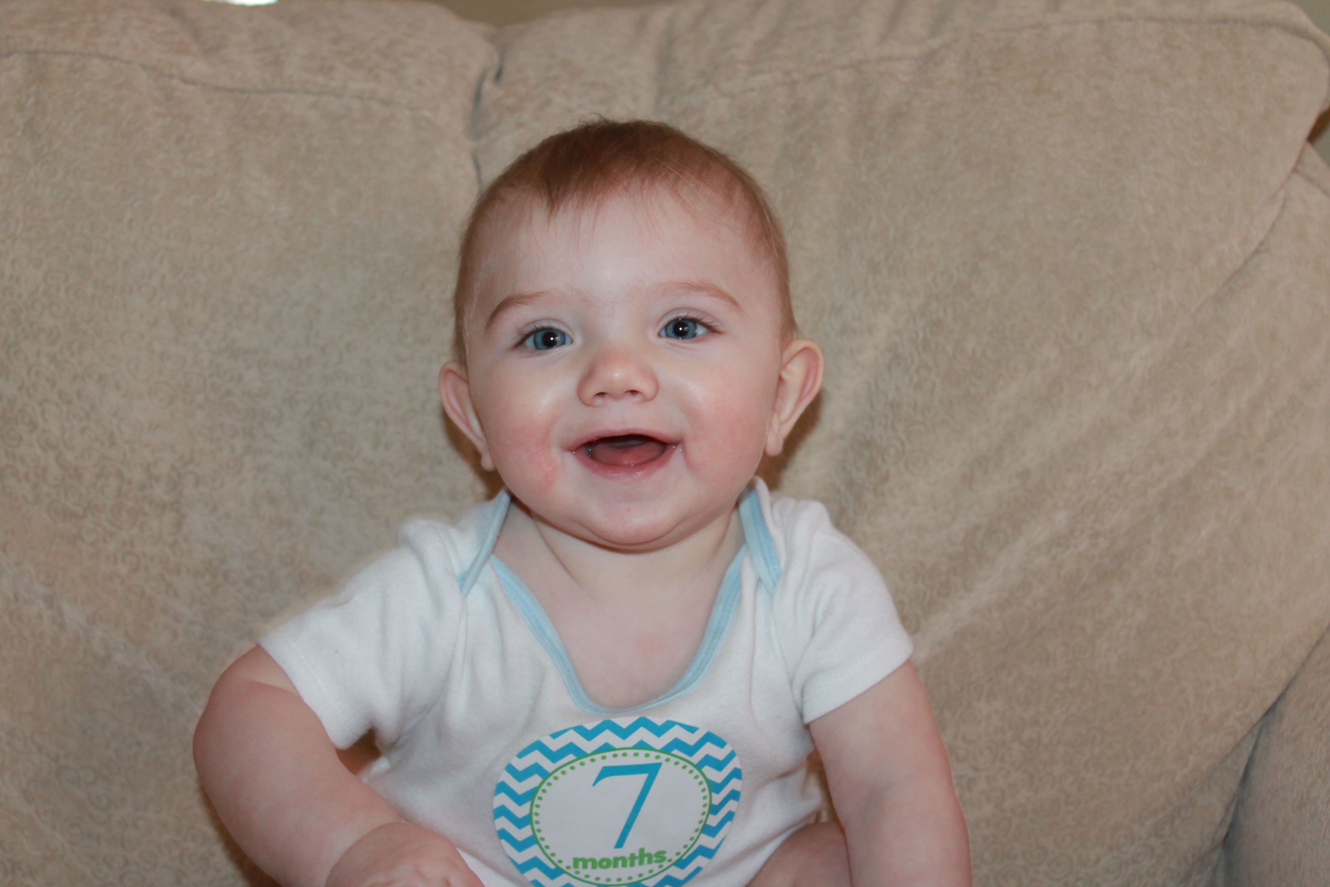 Emry Jane wins the first baby tooth award! She has one bottom tooth. It feels like a little razor blade. She doesn’t crawl on her hands and knees yet, but she can army crawl, scoot and roll to something she wants. She can beat Eli in a race to the phone using this army crawl/scoot combo! She is our Miss Independent. Tommy says her first sentence will be “Me do it.” Haha. She has Daddy TOTALLY wrapped around her fingers. She grins from ear to ear when she sees him or hears his voice. She also really likes Noah. She is smiley and happy at home with us, but still observant and shy around new people and surroundings. It takes her a little bit to warm up, even around immediate family. She is ticklish. Her hair is growing slowly but surely. It looks to be blonde like Eli’s. She likes to be thrown in the air and to “cheer” with Auntie Amy and Mommy. Perhaps she will follow in their footsteps 🙂