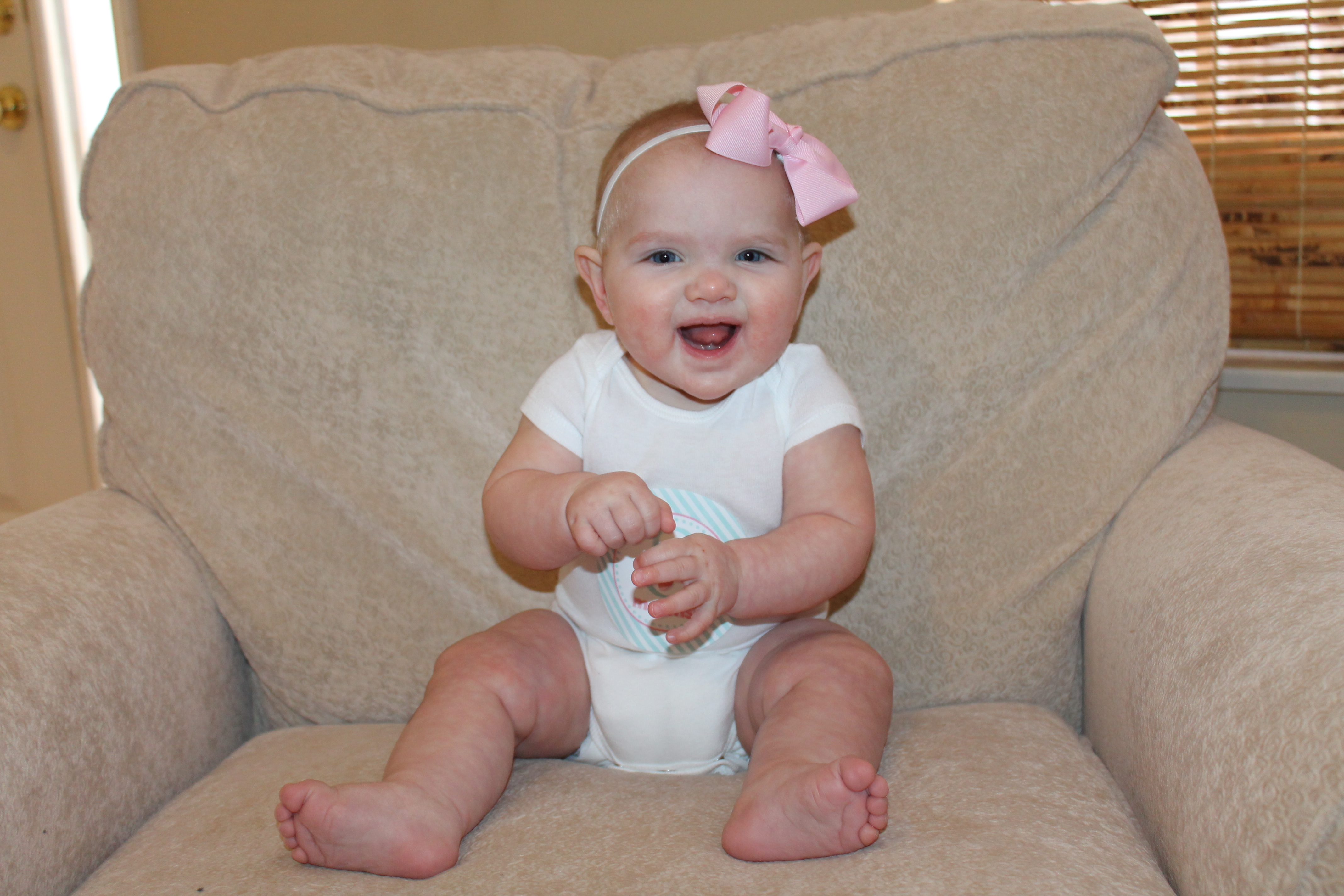 Little Miss Princess Emry Jane now has TWO teeth on the bottom (Emry: 2 Eli: 0 haha.) She communicates through shrieking. No “ma” or “da” for her just yet. She likes to rock back and forth, especially in the rocking chair or her high chair. She does not crawl on all fours but she can do a combination army crawl/forward dive/scoot to get wherever she wants to go! She pushes herself up on all fours and rocks back and forth, so I think she will be crawling that way soon. I tell Tommy that she is unmotivated to move around as much as Eli because she knows that if she sits there and whines someone will pick her up and carry her where she wants to go! She is a princess after all 😉 She is smiley and happy at home and still observant and reserved in unfamiliar places or with people she does not know. It takes her a few minutes to warm up to other family members too. She also gives sweet open-mouthed kisses. She likes trying to stand up in her bathtub and holding bath toys in her mouth (like a dog haha) and splashing with her hands! She has super tiny feet and does not fit into either of her new pairs of baby shoes. She still loves to cheer and be thrown up in the air– it’s her favorite game by far. “1, 2, down, UP” we throw her in the air and she giggles when we catch her. Think we have a future cheerleader on our hands?! We are working on her holding her arms up above her head. She has a temper FOR SURE and hates “baby jail.” We have a big playard set up downstairs with a mat and toys. She will only play in there (without screaming) if Mommy or Daddy is in there with her.