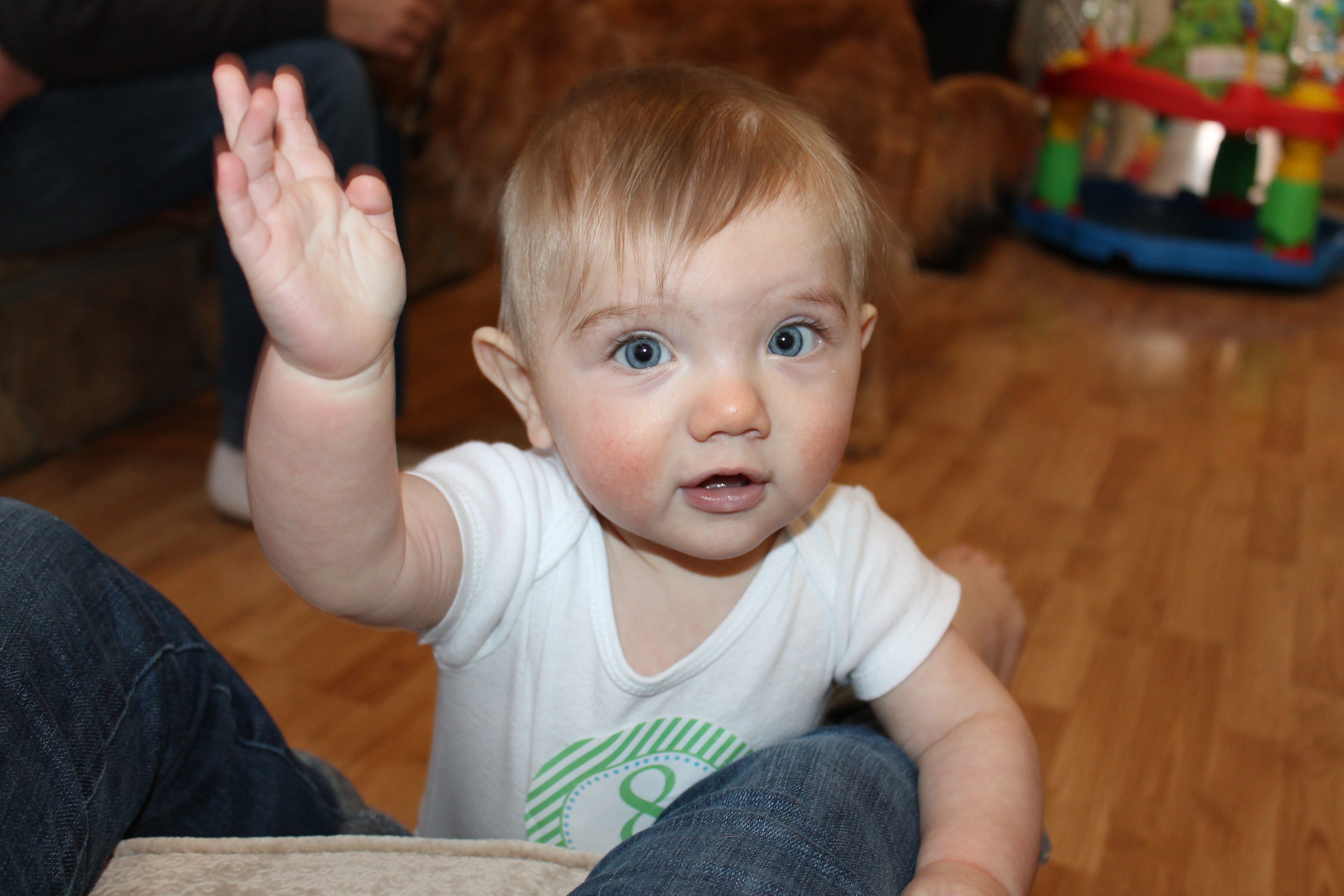 Elijah is really earning his nickname “Monkey” these days. He has learned to pull himself up and wants to do so on EVERYTHING. We have lowered his crib but he still likes to stand and chat when we put him down for naps. Eventually he will lie down and fall asleep but it takes longer now. He pulls up then lets go so he has CRASHED several times! Luckily, those crashes have been upstairs in their nursery where there is little to hurt him if he falls. He is beginning to sit down when he lets go so he lands on his cushy cloth-diapered bottom and not hitting his head! He is very interested in the playroom and he can crawl FAST after whatever toy of Noah’s he wants in there! I have to make sure I close the nursery door when I am pumping or he will disappear into Noah’s playroom as soon as he is done eating. We are working on dividing the playroom and making it more baby-friendly but, for now, the babies have to be very heavily supervised in there– too many tiny big boy toys and choking hazards! We also always close the gate at the top of the stairs, just in case Monkey gets the idea to go down on his own! It’s a whole new ball game with mobile babies, folks!! Eli says lots of “mamamama” and others. The other day he was crawling after me and saying it– does that count as his first word? I think he knows I’m “Mama” (at least we are working on it every day) but I’m not convinced that he is saying it isolated and directed at me just yet. He says “dadadada” “babababa” and something that sounds a lot like “hi/bye” too. His favorite game is Peek-a-boo. Also, he gives lots of smiles and wide open-mouthed KISSES. He’s such a sweet and loving boy!