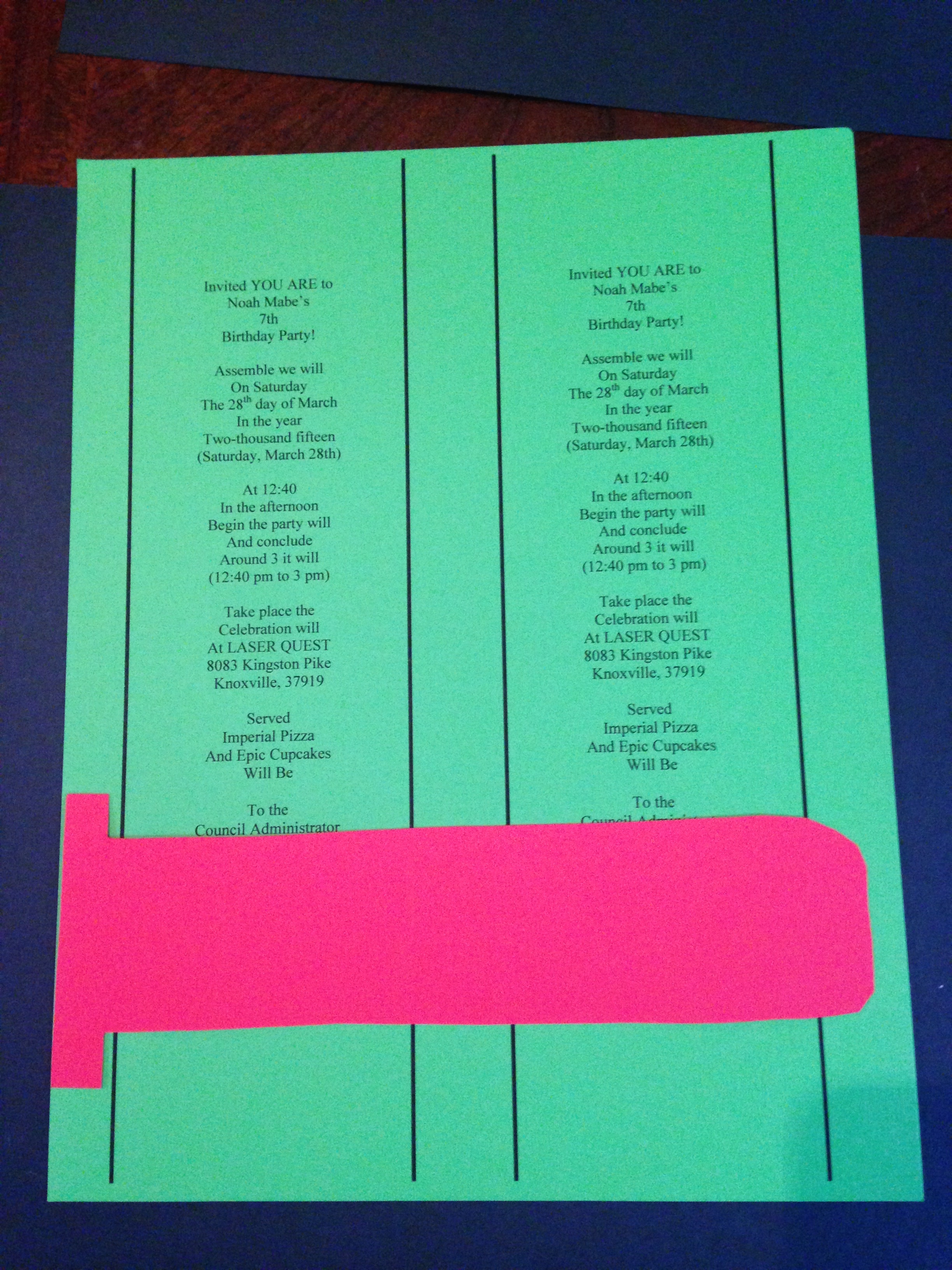 This is a shot of how the invitation looked when it was received and how it looked when it was extended. It was a lot of work, but it turned out really COOL! Noah loved them, so it was all worth it 🙂