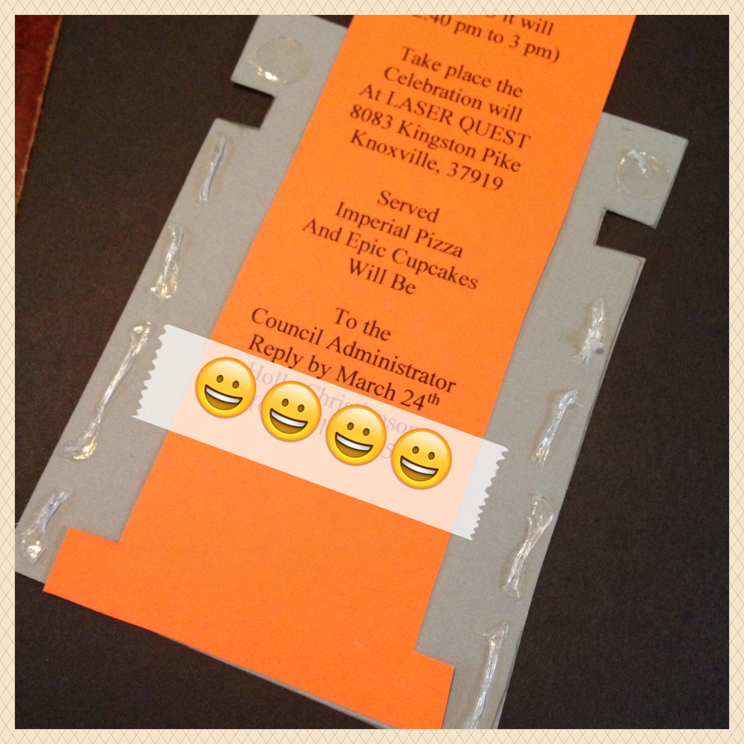 I typed the invitation in Word on the computer and printed it on the different colors of cardstock. I bought the cardstock, glue dots and tan envelopes at Hobby Lobby. I printed a couple sample invitations on white paper so that I could play around with the shape of the lightsaber. It had to fit in the envelope for mailing, so it took a couple of tries to get the right shape.