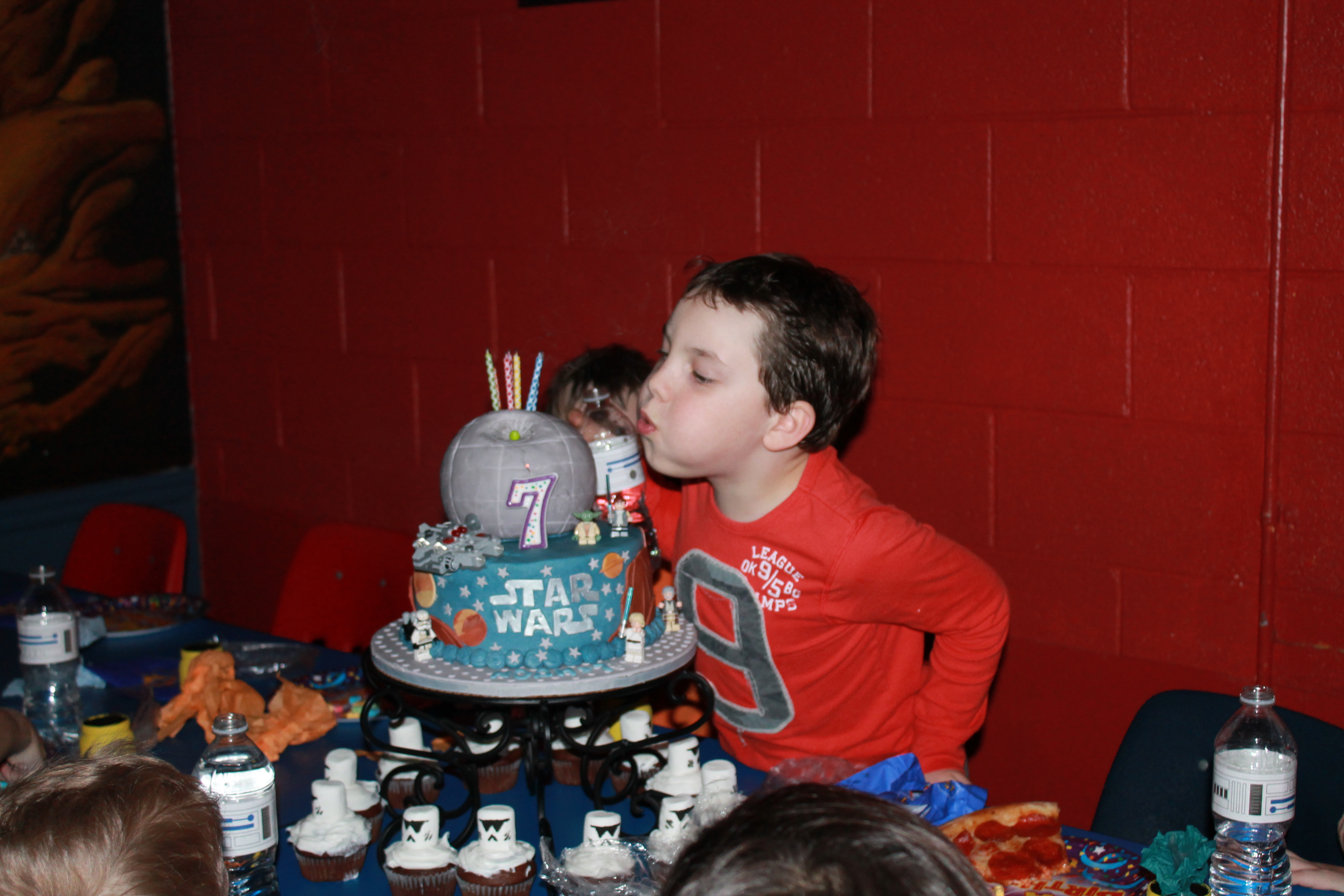 There were also water bottle labels to look like R2D2. I did not get a picture of those specifically, but you can see them in the picture of Noah blowing out his 7 candles on the Death Star. It was made out of rice krispy treat– and awesome!