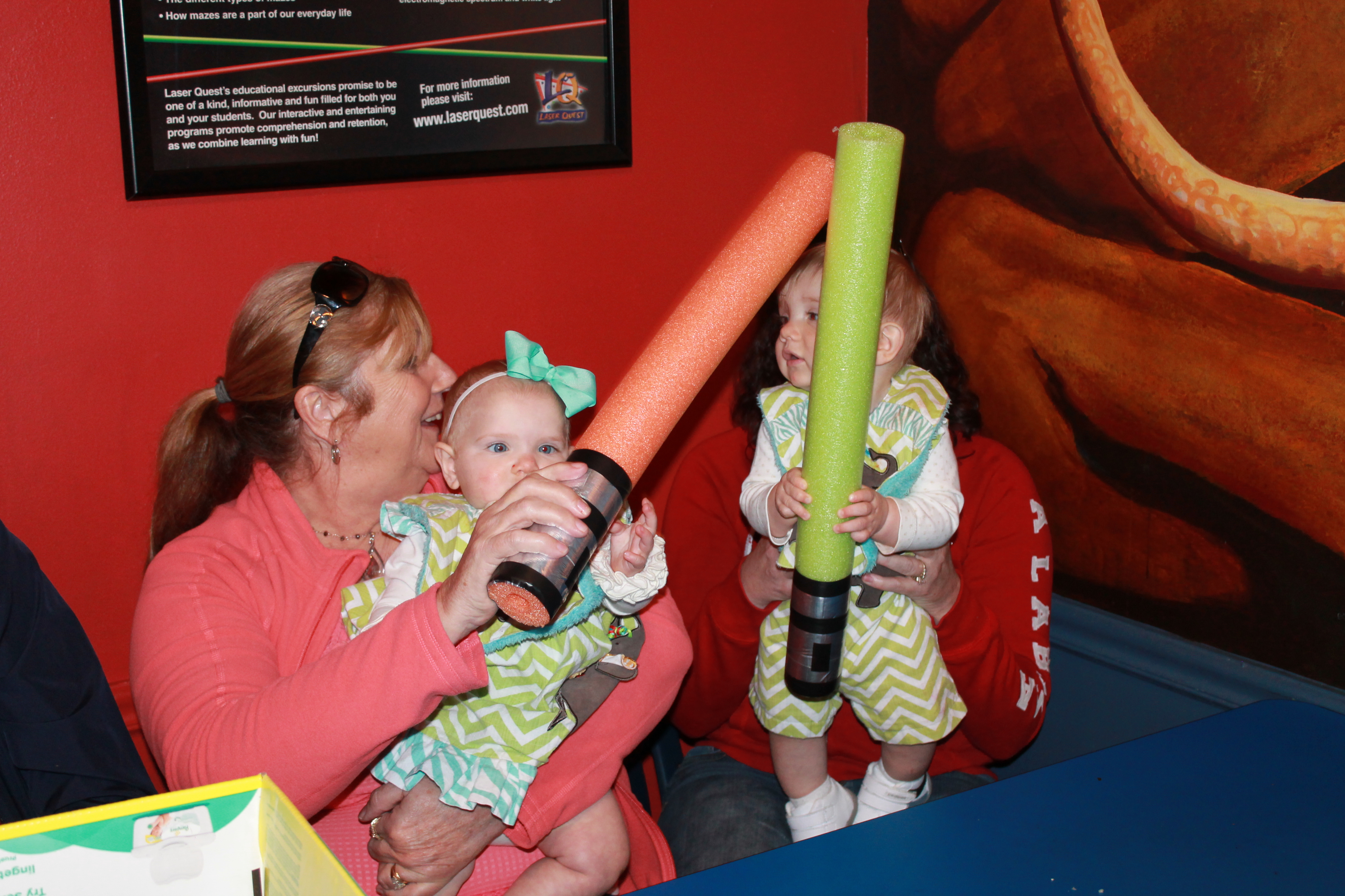 After filling them with cake and pizza, we let the kids have a lightsaber “battle” with their new lightsaber party favors. It was INSANE and the kids loved every minute of it. Tommy got thrown in the middle and even the twins enjoyed a little jousting!