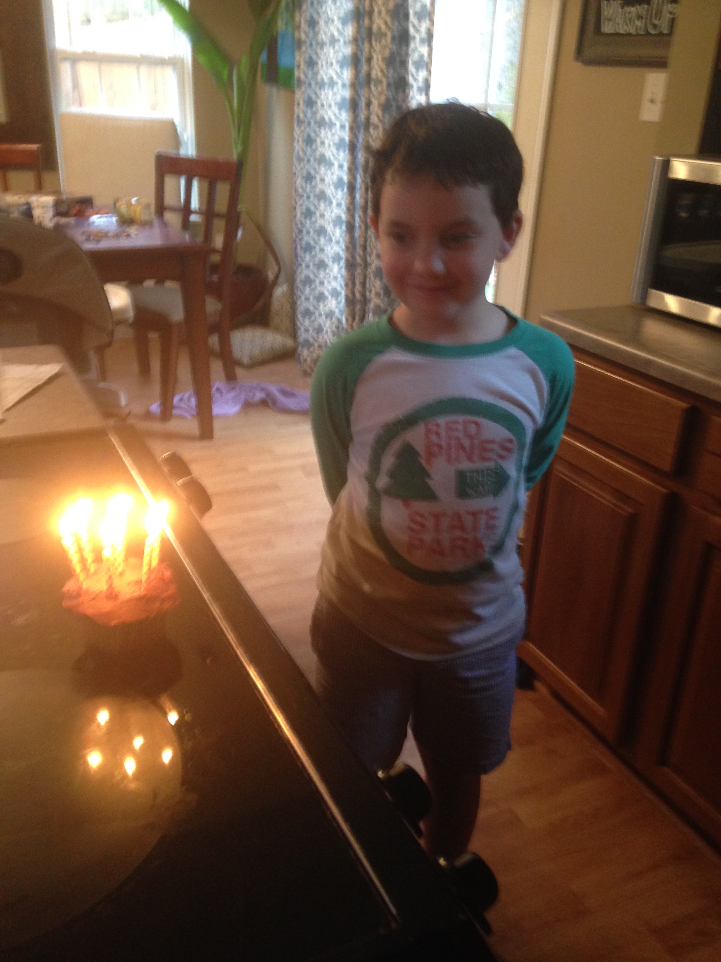 I made yellow cake with chocolate icing cupcakes for his “real” birthday. We stuck 7 candles on one so that we could sing “Happy Birthday” to him.