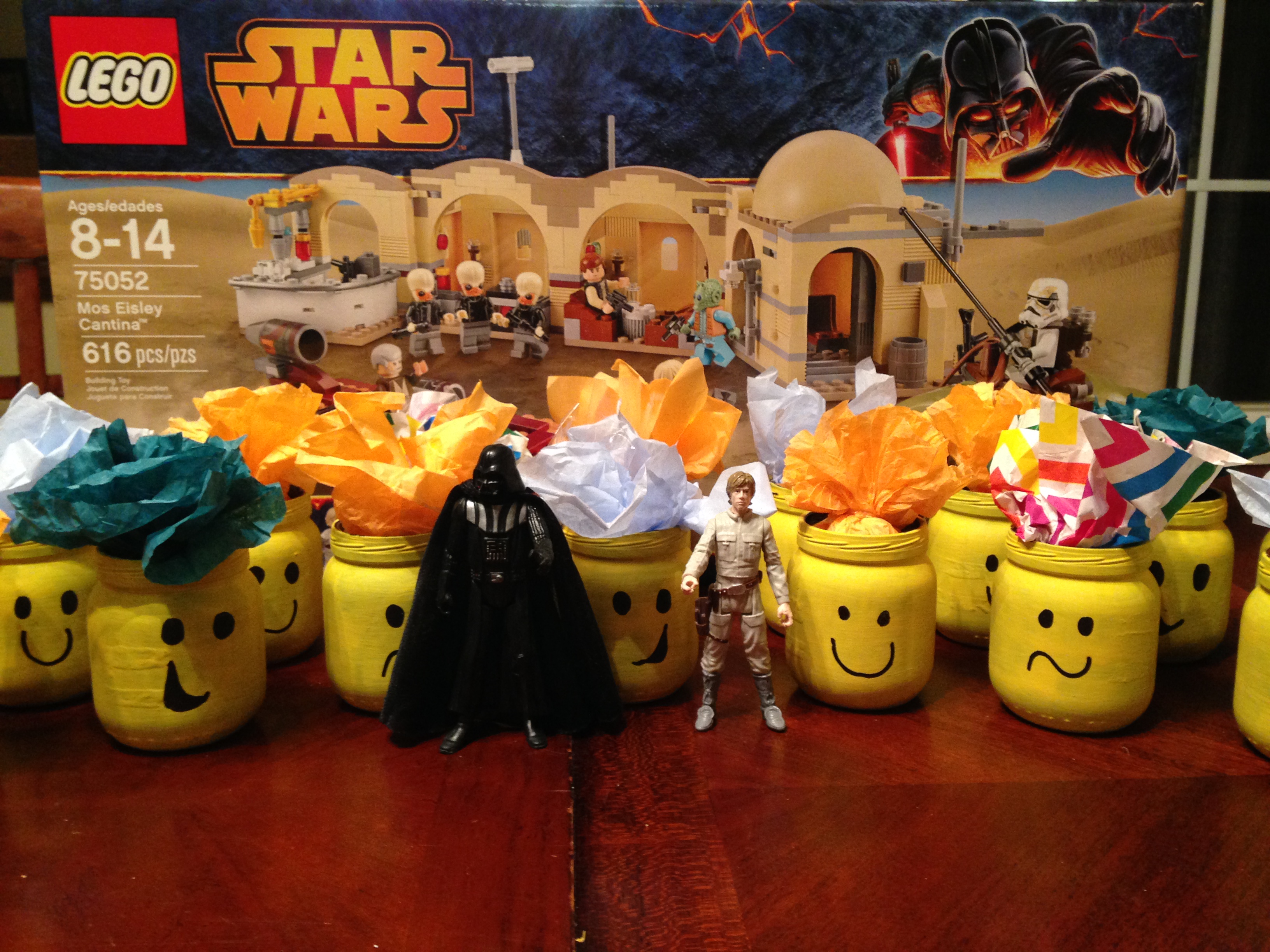 The party favor for each child was a lightsaber (next picture) and a homemade Lego head filled with Candy Blox. The Blox were awesome because they actually stick together like real Legos. They tasted a lot like Smarties.