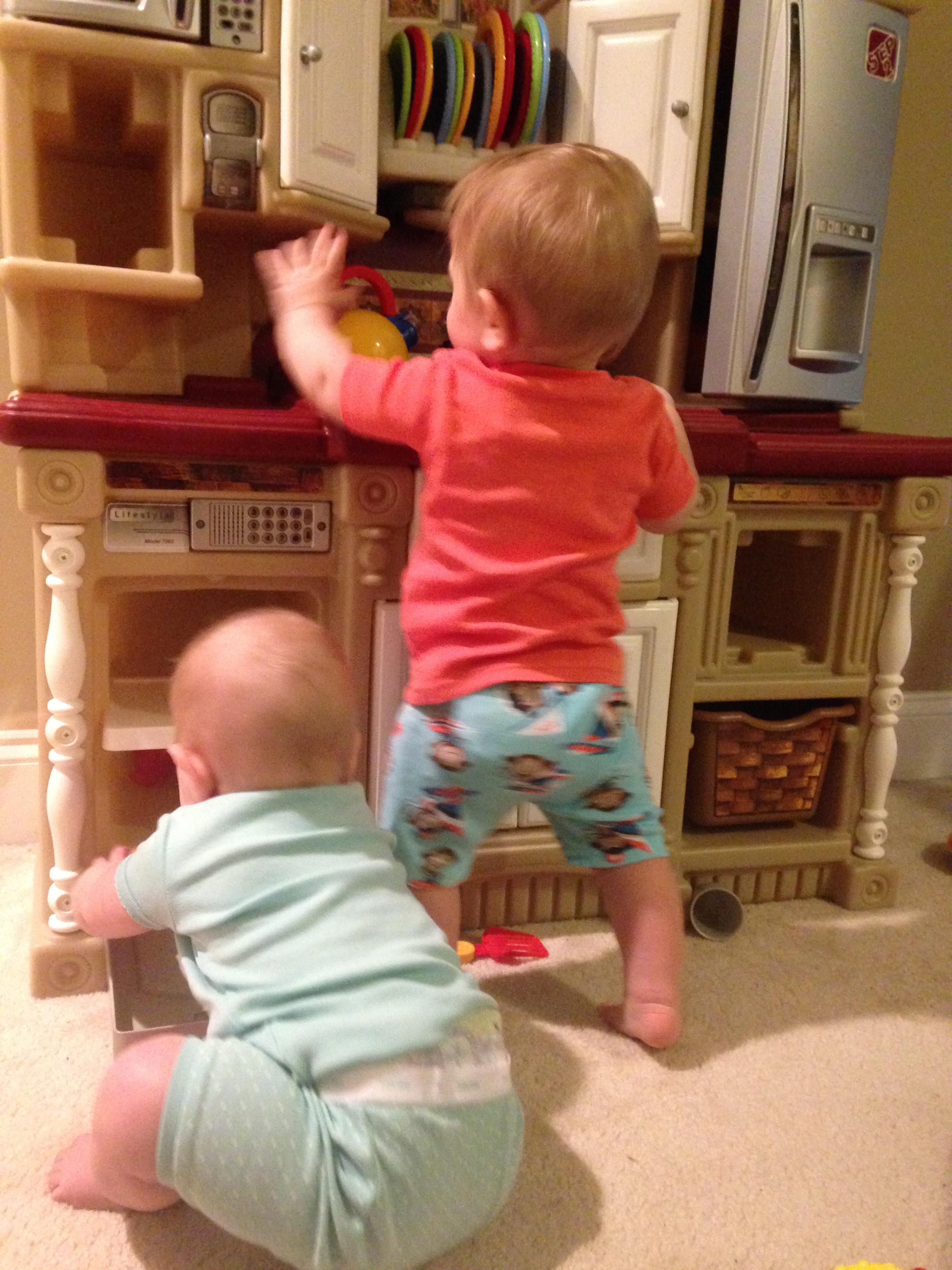 The twins got an early birthday present from Mommy and Daddy last week– a play kitchen. It is so cool. The buttons for the oven, microwave and handheld phone all make noise. The stove makes boiling and frying sounds when the pot or skillet are set on it. We bought it used and cheap from a local resale group page and the kids LOVE it, even Noah plays with it at least once a day. We plan to buy them some play food for the kitchen for their first birthday.