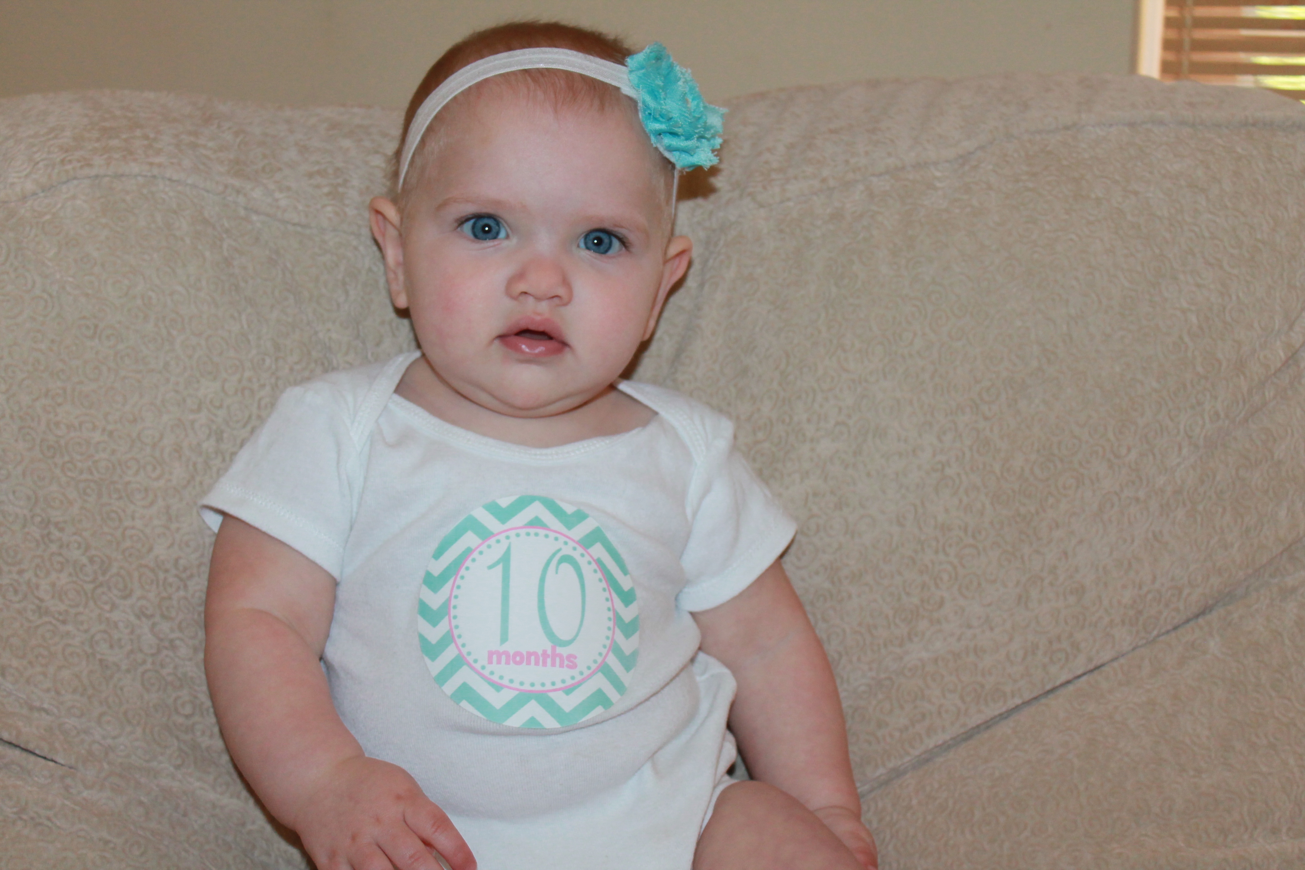 Emry Jane will make all sorts of faces for my camera, but no smiles! She is working on her fourth tooth, second one on top. She says “Mama” like crazy and “Da” or “Dada” when she feel like it 🙂 She can stand on her own for a second or two. She wants to be held all the time…and you have to be standing when you hold her or she gets upset. Princess, for sure! She naps well and sleeps great at night. 90% of the time, she will leave her bow alone, but if Eli tries to pull it off then she is done with it for a while. If she takes off a bow, she tries to feed it to Manning. She sticks her tongue out when she gives kisses so you always get licked if you want love from her. She also clicks her tongue– her newest trick. She likes most food, but currently is refusing raspberries, which she used to like. Her favorite food is blueberries.
