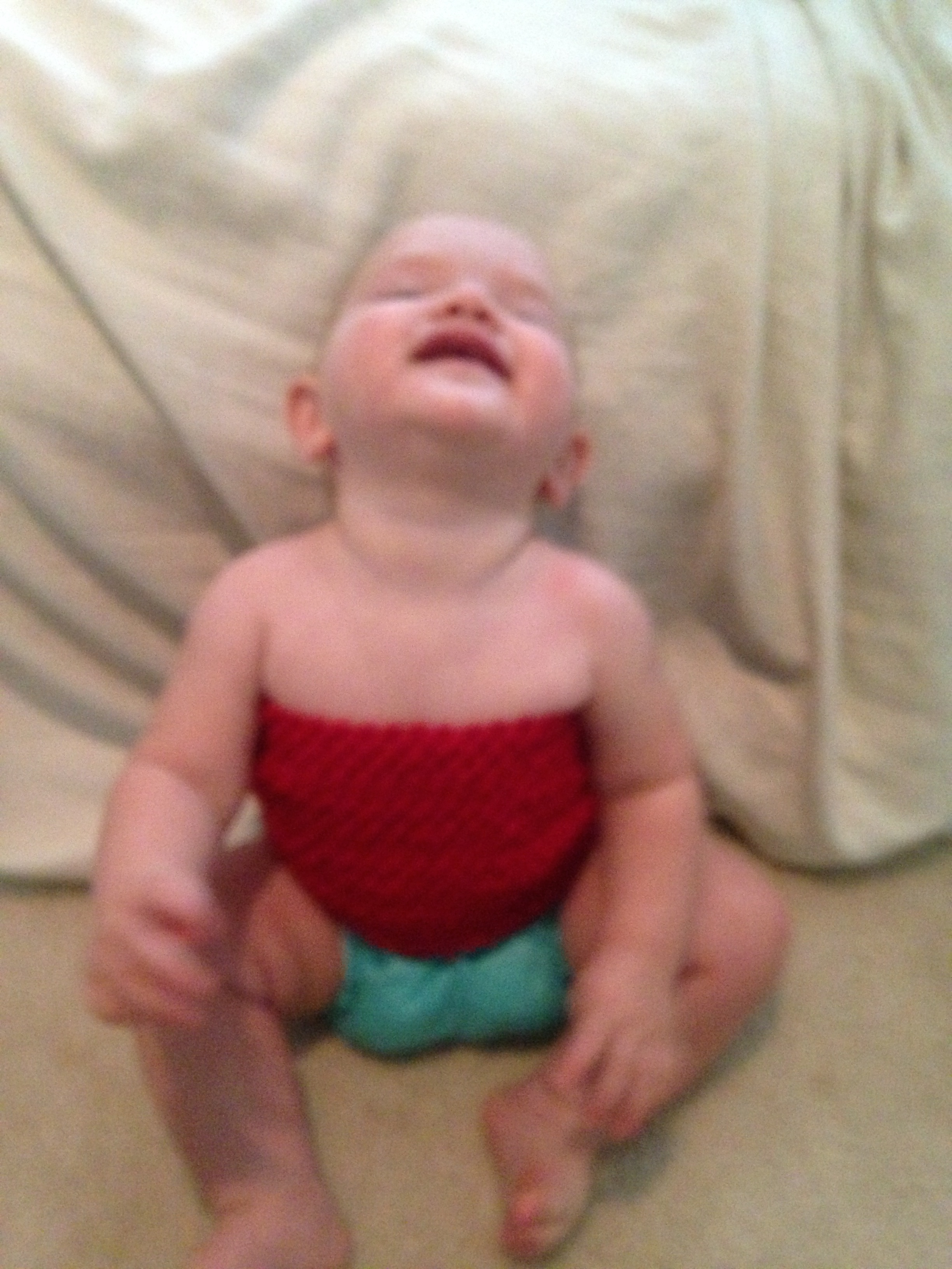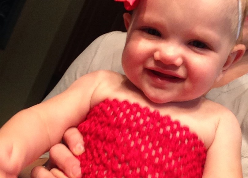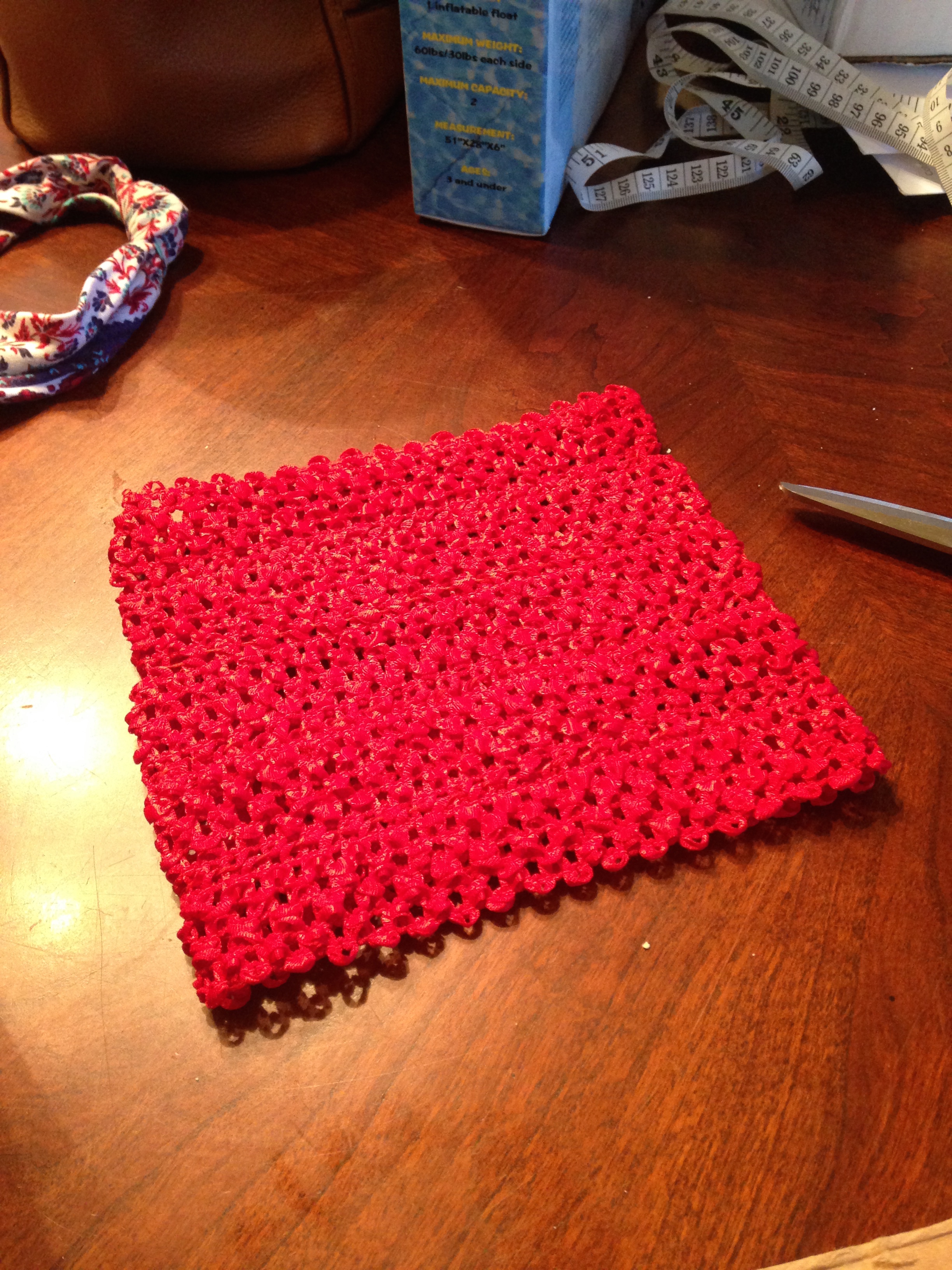 Insert DIY FAIL 😦 I sewed the ends together to make an EJ-sized tube top. The thread was not stretchy, so I could not get it over her head. I had to cut it apart and come up with a new way to get it to stay on her little body.