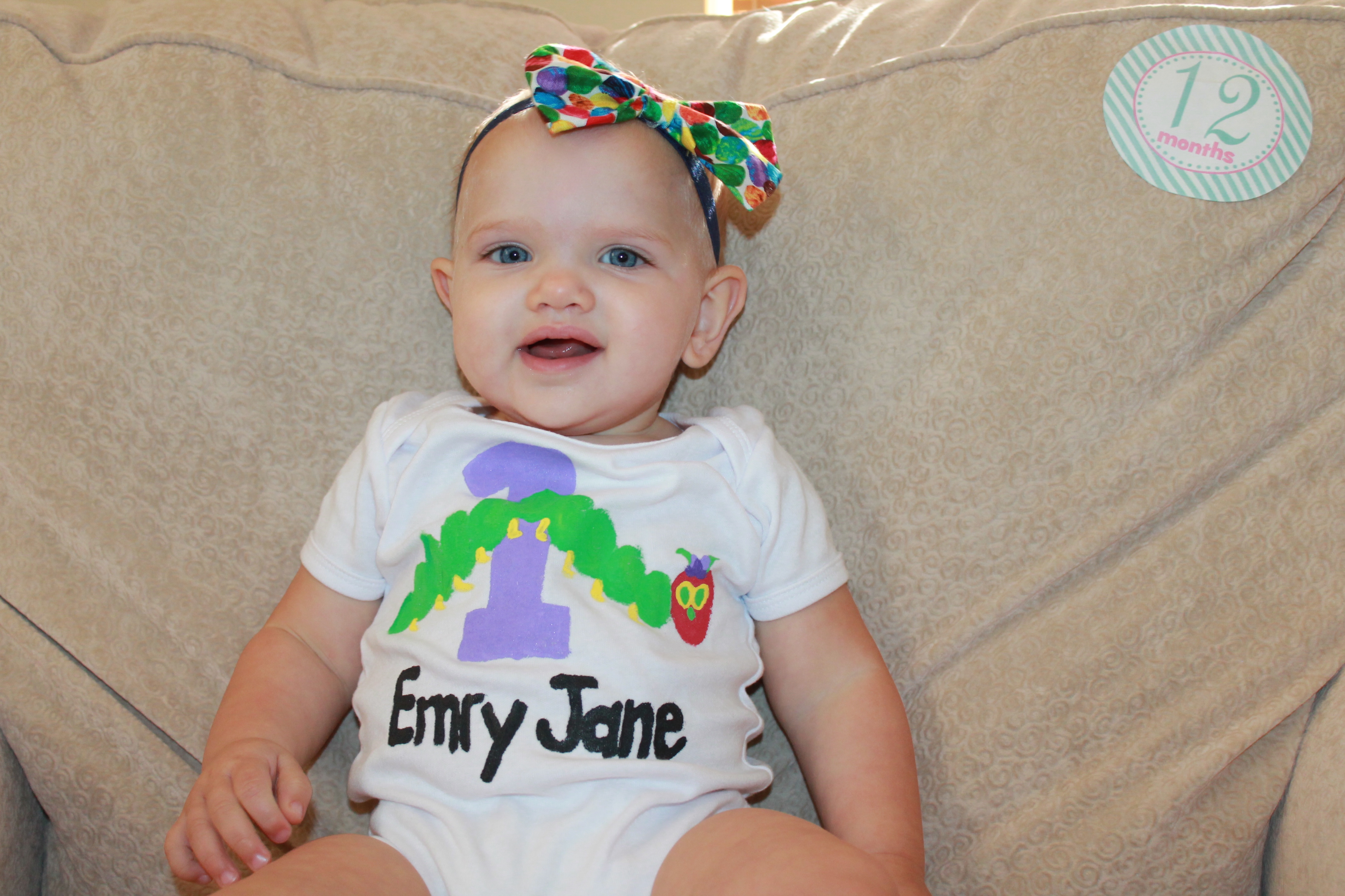 Emry Jane is our pint-sized princess. She has all the boys in this house wrapped around her finger. I am pretty sure that she already knows it! She would love to spend all of her time with Daddy, except during the night when only Mama will do. She started crying out “Mama, mama” at night a few days before her first birthday. Now, Eli does it too. Talk about pulling on the heart strings! She likes to stand up on her toes. Emry Jane has become quite a fast crawler and can walk 4-5 steps at a time. Sometimes, she tries to walk on her toes, so she falls down after a step or two. She has great balance. She likes to stunt, cradle and cheer– she is quite the little flyer already! She weighs 18 lbs, 6.5 oz. (27th percentile) and she is 27.25″ tall (3rd percentile.) She weighs almost 3 whole pounds less than Eli. She has six teeth, 4 on top and 2 on bottom, just like Eli. She says Mama, Da (Dada,) do (dog) and ba (ball.) She communicates quite a bit through pointing. She likes to point to things that she wants and where she wants you to take her. She stands beside her high chair when it’s close to meal times to let you know that she is hungry. Emry Jane smiles a lot these days but still takes time to warm up to strangers and family that she has not seen in a while.