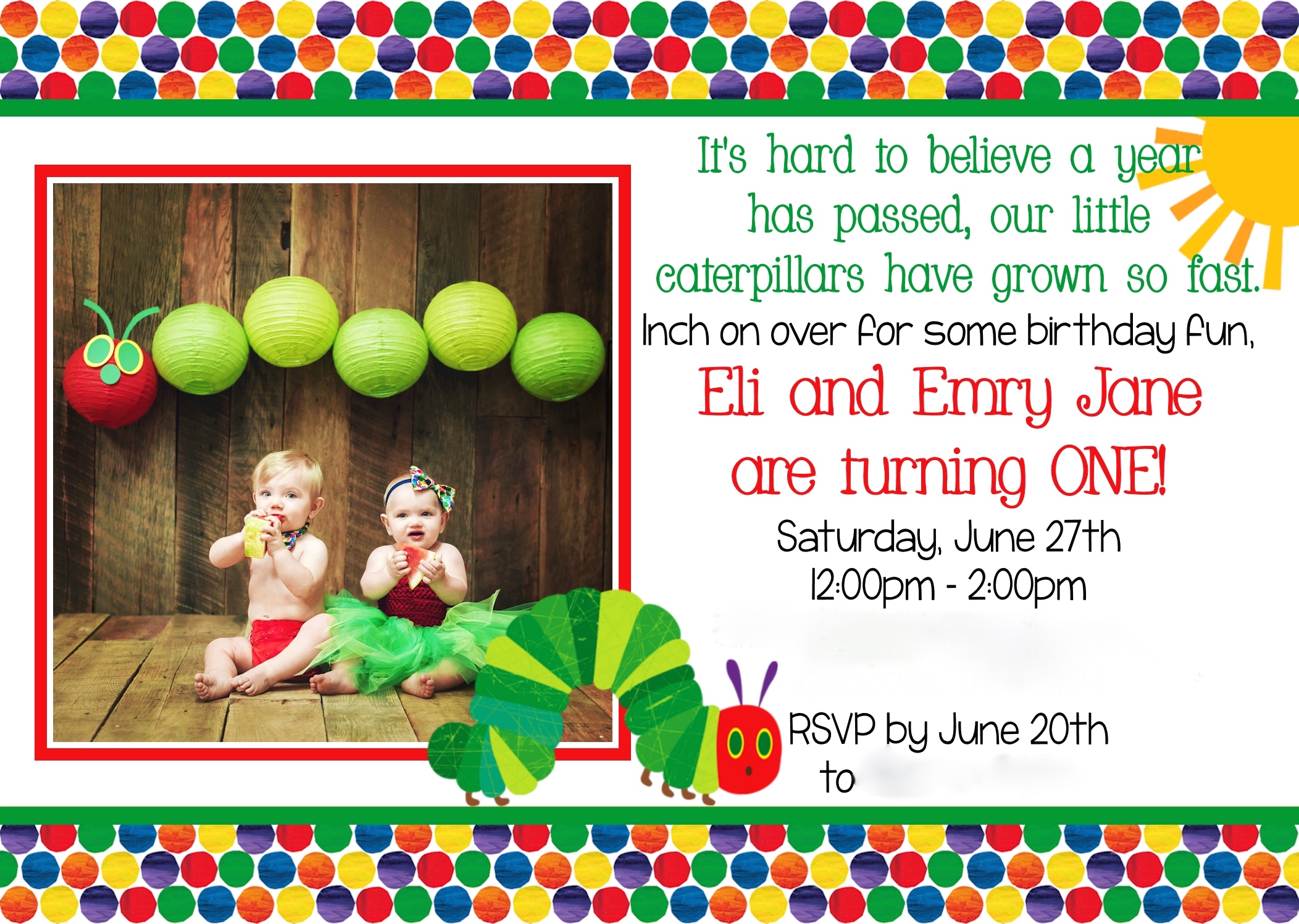 Tis’ the eve of my sweet babies turning 13 months, so it’s about time that I get their #veryhungryfirstbirthday up on our family blog! If you are an instragram-er, you can check out lots of our birthday pictures by searching for that hashtag 🙂 {Part 1} is about the idea for a Very Hungry Caterpillar-themed party and the photo shoot that the twins had for their photo party invitation.