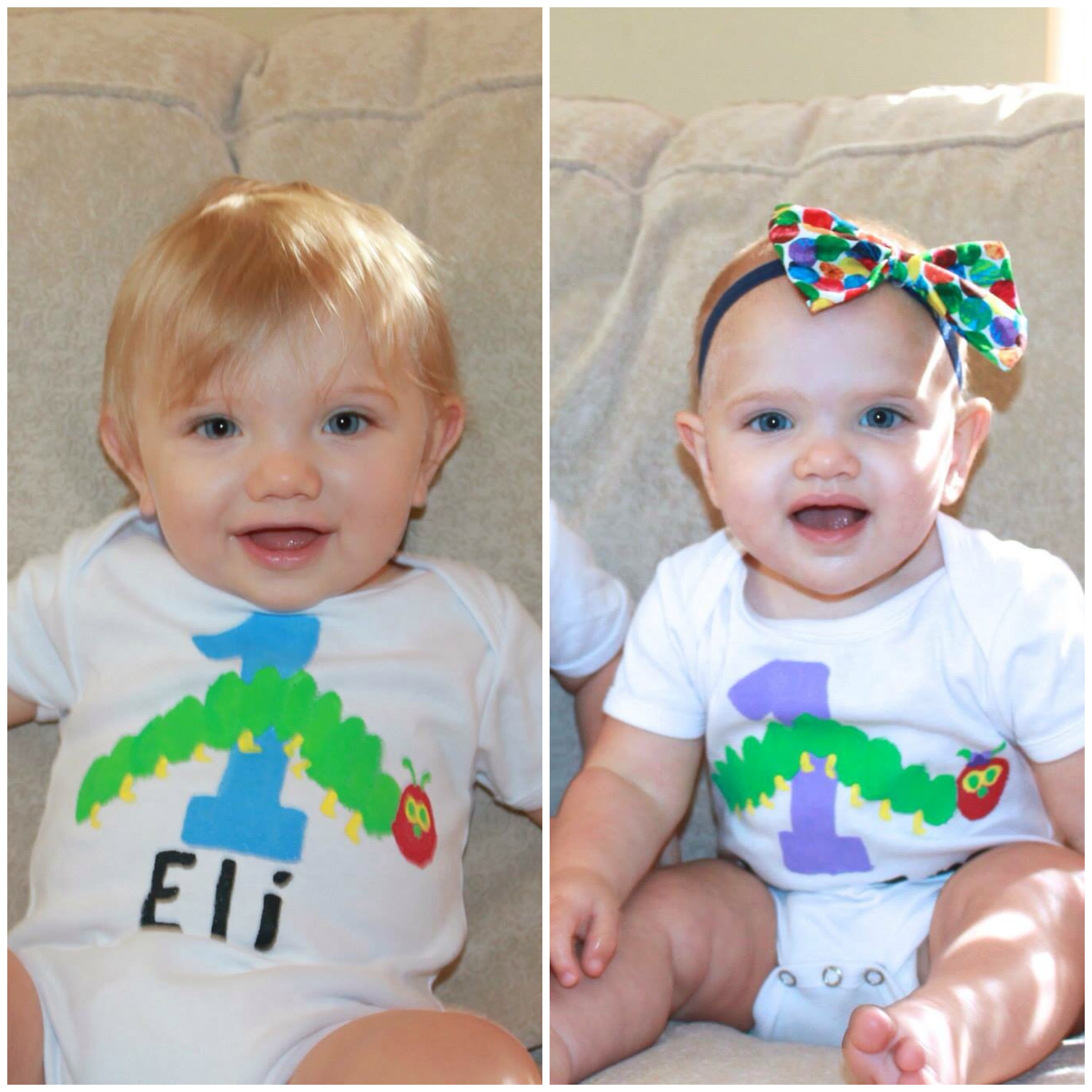 After breakfast, I took advantage of having TWO photography assistants (Amy and Marcia) and snapped the babies’ 12 month monthly photos before morning nap. I painted those VHC onesies the night before for the monthly photo and to wear again during the smash cake portion of their birthday party. I made the polka dot bow and matching bow tie from fabric that matched Emry Jane’s birthday party dress. You can find more photos from this little shoot in their 12 month blog post.
