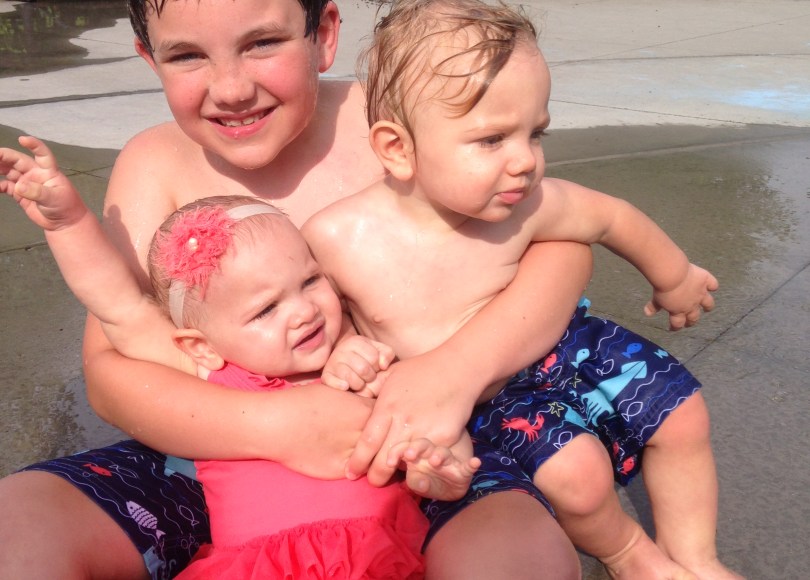 Two days post-surgery, Noah could not do much but he did sit around in the water with the babies. They were not too fond of the idea of being held down for this picture 🙂