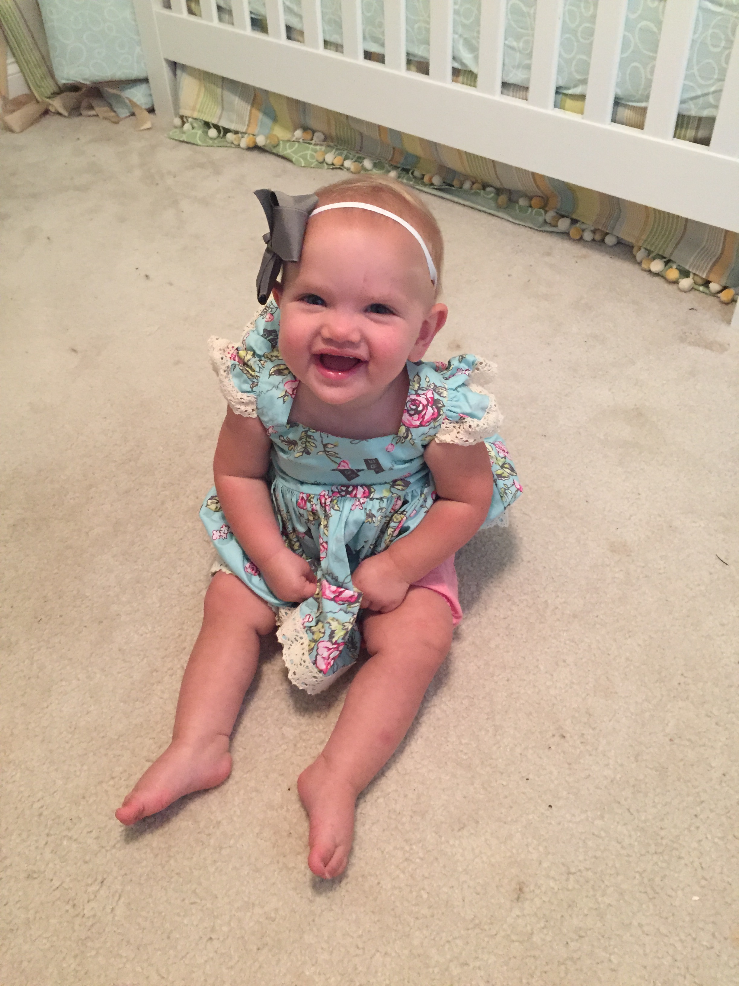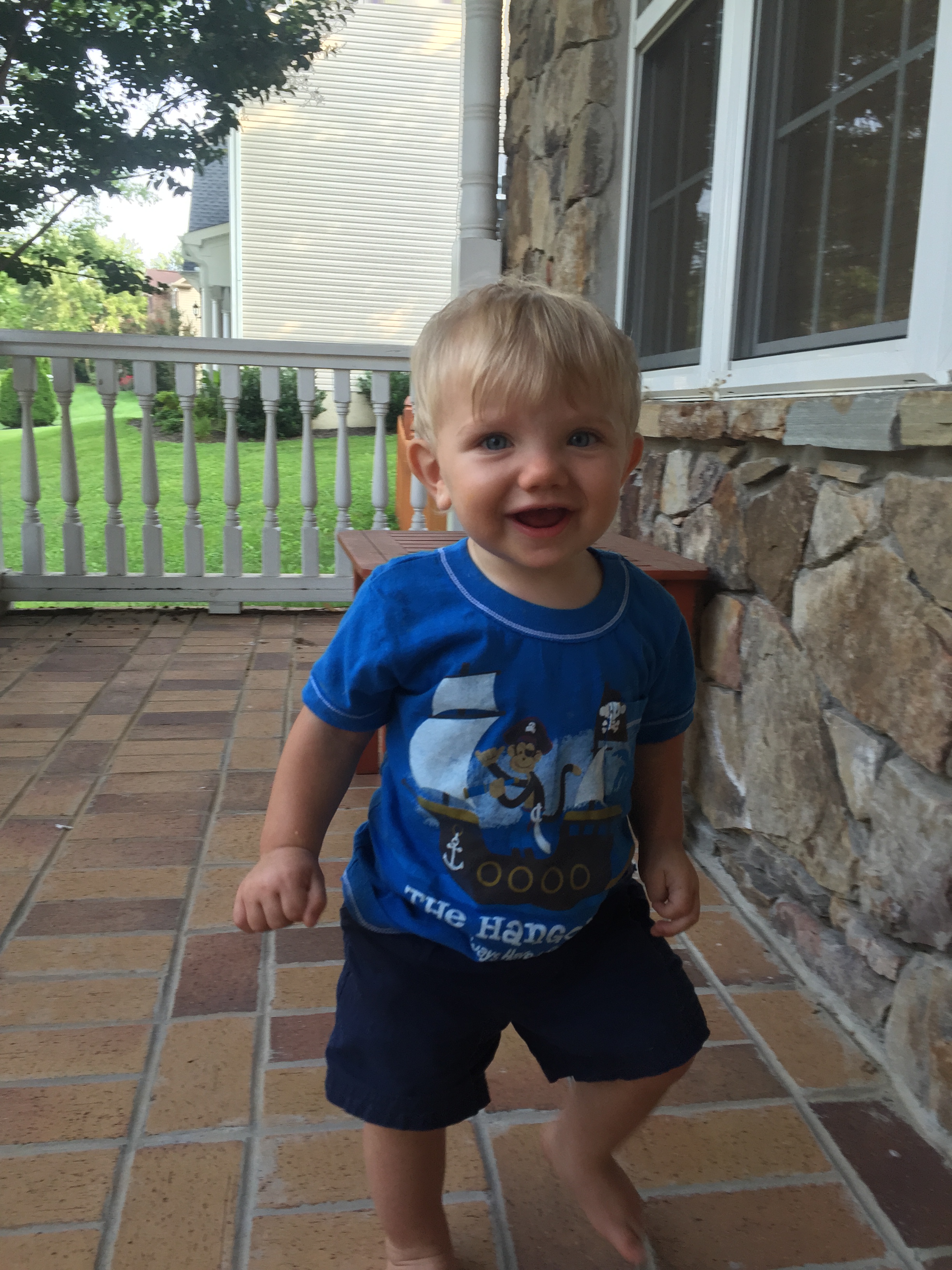 Eli can sign the word “more.” He can wave hi and bye. He said “Papa” (maybe even “Nana” a time or two?) when we were visiting Nana and Papa in NC for Nana’s birthday. He is also working on saying “bye bye.” He likes to RUN. Walking is for babies. This kid is full-blown TODDLER 🙂 He is a very fast climber and is known to push toys beside chairs or the couch so that he can climb onto them. He has climbed all the way up to our DVD player via riding toy to chair to table! He’s such a monkey!! He’s very smiley and social and LOVES to carry his blanket around like Linus. He also loves water. Bath times are the best, but he also likes to swim with his floaties. He kicks his feet and everything!