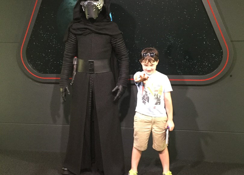Noah’s first Fast Pass was for Star Tours. He was so excited about it and, thanks to Rider Switch, he got to ride it once with each of us. Emry Jane napped in the stroller while Eli and I watched the Trials of the Jedi show outside the Star Tours ride. He was fascinated by the show until Kylo Ren came out, then he was terrified. When we went to the Star Wars Launch Bay to MEET Kylo Ren, Eli went into hysterics once we were in the same room as him. The Disney Photo Pass lady got a picture of Eli screaming, while I was trying to get this picture of Kylo Ren and Noah together.