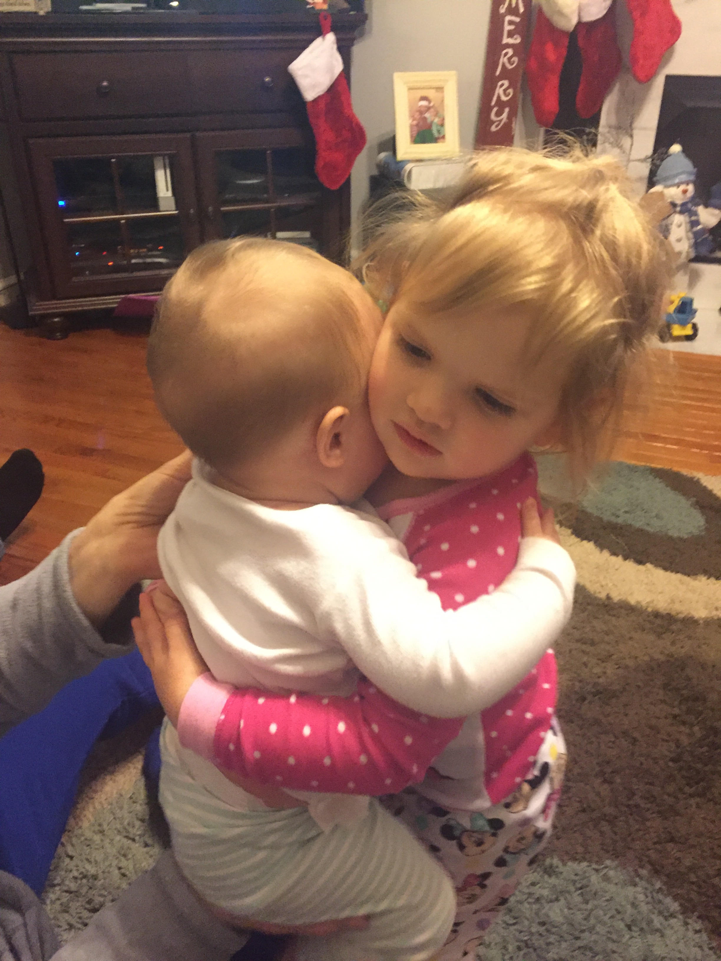 On Friday, the girls minus Emry Jane went to get pedicures together. Tenley was admired by everyone in the nail parlor while she sit in her Mama’s lap. Afterwards, we had Camino for lunch (a middle Tennessee staple and a must-have every time we go visit) before heading back to Marsh’s house to watch the Tennessee Volunteers play Nebraska in their bowl game. Tennessee won solidly– woohoo! I didn’t really take any pictures on Friday (shocking!) but these two pictures that I got of Emry Jane holding (with help) Tenley is worth all the heart-melting.