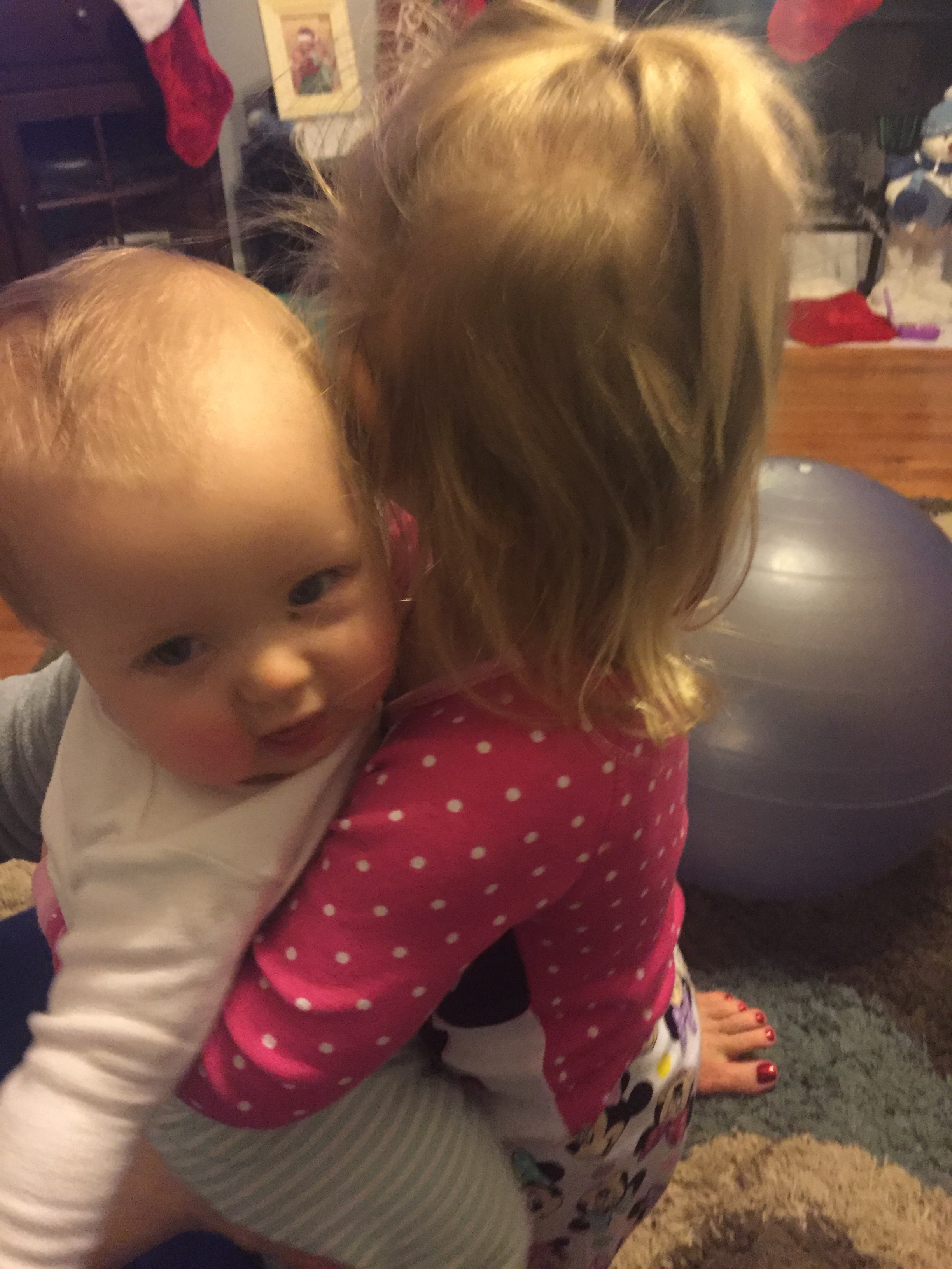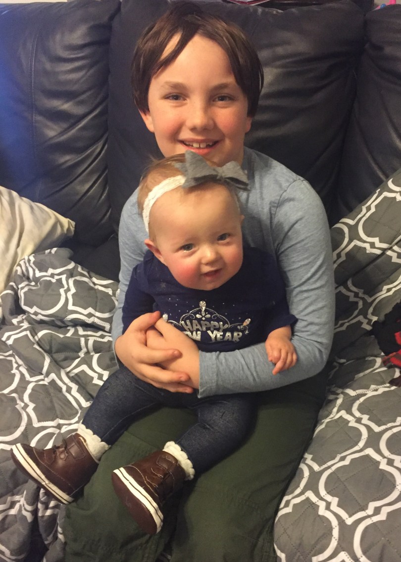 Eli and Emry Jane were so excited to see their Baby Tenley. Emry Jane immediately wanted to hold her on the couch. Tenley was not so excited about the holding. I think it was because I set her down vs. continuing to walk around with her. They also enjoyed helping her bounce and jumped with her in the doorway (above.)