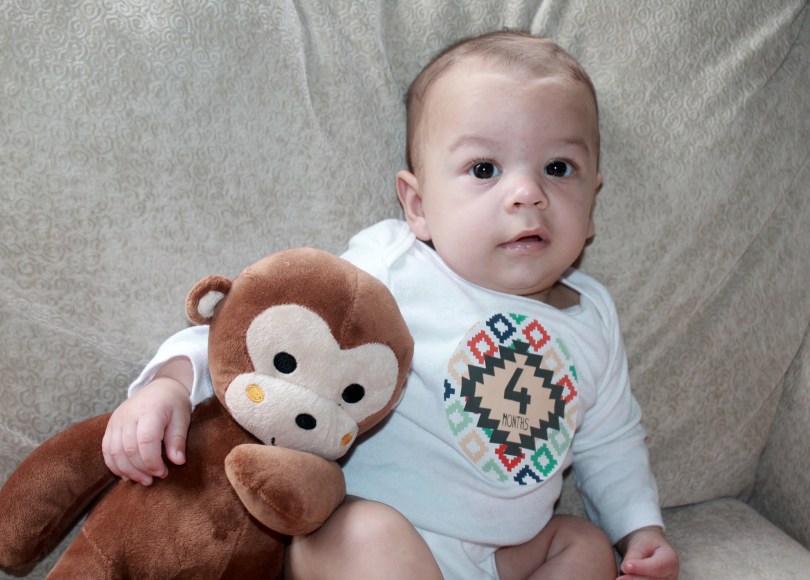 During Month 3, Nathan started drooling more and gets to wear bandana bibs from Copper Pearl whenever he’s not in a sleeper. They are absorbent and super cute! He chews on his hands all the time. We can see the little tooth buds under the gums, but no teeth yet!